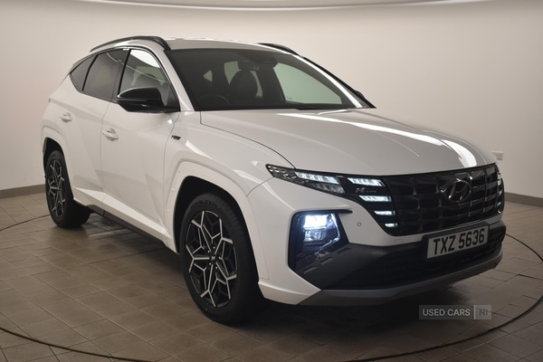 BelfastInsurance Group 19, 0 Previous Owners, This Hyundai TUCSON 1.6 TGDi Hybrid 230 N Line Auto is well suited to those seeking a practical vehicle with a modern driving environment. With 26,507 miles on the clock, this TUCSON offers the advantages of hybrid technology, smooth automatic transmission, and a userfriendly driving experience. The N Line specification includes supportive leather and suede upholstery, heated front seats, and dual zone climate control, all contributing to comfort on every journey.Strong performance is delivered by the 230 bhp hybrid powertrain, enabling the vehicle to accelerate from 0 to 60 mph in 8 seconds, with a top speed of 120 mph. The drive mode selector allows the driver to tailor the car's responsiveness to changing conditions or preferences, and cruise control helps maintain ease on longer journeys.Styling is a key strength, with the white paintwork complemented by the N Line design elements such as exclusive front and rear bumpers, a rear spoiler with fins, sports twin tip exhaust, and gloss black door frame mouldings. LED headlights with static bending function, dark chrome effect grille, and tinted glass with windscreen shade band enhance the vehicle's presence. Alloy pedals and a black headliner add a sporty touch to the interior, while privacy glass ensures a sense of refinement.Specification highlights include the 10.25inch touchscreen satellite navigation system with Apple CarPlay and Android Auto, wireless phone charging, and front and rear parking sensors with reversing camera for added convenience. Advanced safety features such as Forward Collision Avoidance Assist, lane keep and lane follow assist, multiple airbags, and tyre pressure monitoring system offer reassurance in daily use. Additional practicalities include roof rails, an electric parking brake with auto hold, and smart key access with engine start/stop button
