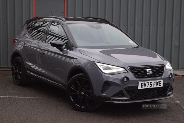 LisburnInsurance Group 14, The SEAT ARONA 1.0 TSI 115 FR Black Edition offers a refined driving experience, appealing to a diverse range of drivers. With a low mileage of just 3,163 miles, this hatchback provides a modern blend of practicality and comfort. The automatic transmission ensures smooth progress in both urban and longer journeys, while features such as SEAT Drive Profile, park assist system, and a rearview camera contribute to an enjoyable, confidenceinspiring drive.Finished in sophisticated grey, the ARONA Black Edition presents a striking appearance, enhanced by black roof rails, window surrounds, and side skirts. The bodycoloured bumpers and door handle inserts add to the cohesive design, while details such as lasered B pillar lettering and twin exhaust pipe styling emphasise its distinctive character. Dark tinted rear windows, a rear spoiler, and LED lighting elements create a contemporary, purposeful look.Inside, the ARONA offers thoughtful design with microsuede cloth upholstery, ambient interior lighting, and a perforated flatbottomed leather steering wheel, gear knob, and handbrake with red stitching and FR branding. The dual zone climate control, heated front sports bucket seats, and adjustable steering column ensure comfort for both driver and passengers. The double boot floor and split folding rear seat provide flexibility for varying luggage requirements.Specification highlights include a 10'' digital cockpit, full link smartphone integration with wireless Apple CarPlay, Android Auto, and a wireless phone charger. Driver aids such as lane keeping system, tiredness recognition, hill hold control, and multicollision braking enhance safety. Additional features comprise automatic full LED headlights, rain sensing wipers, electrically adjustable, heated, and folding door mirrors, and ISOFIX anchorage points in the rear, contributing to both convenience and peace of mind