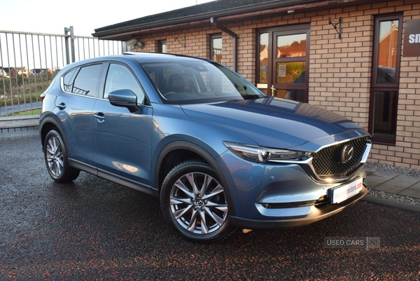BelfastInsurance Group 16, 1 Previous Owner, This Mazda CX5 is a manual petrol 2.0 SPORT NAV+ model and it has covered only 58700 miles since its first registration in August 2019. In excellent condition both inside and out, this good looking Mazda has some great features including Eternal Blue exterior paintwork, full black leather upholstery, 7" touchscreen media, 10 speaker BOSE DAB audio with usb, Apple CarPlay, Android Auto, front and rear parking sensors, reverse camera, lane departure warning system, lane keep assist, forward collision warning system, blind spot monitoring, auto lights and wipers, leather heated steering wheel, multiple Mazda safety systems, Thatcham Cat1 alarm and engine immobiliser, ISOFIX and much more besides. Great value CX5 with service history and 6 months warranty included. Well worth a look.