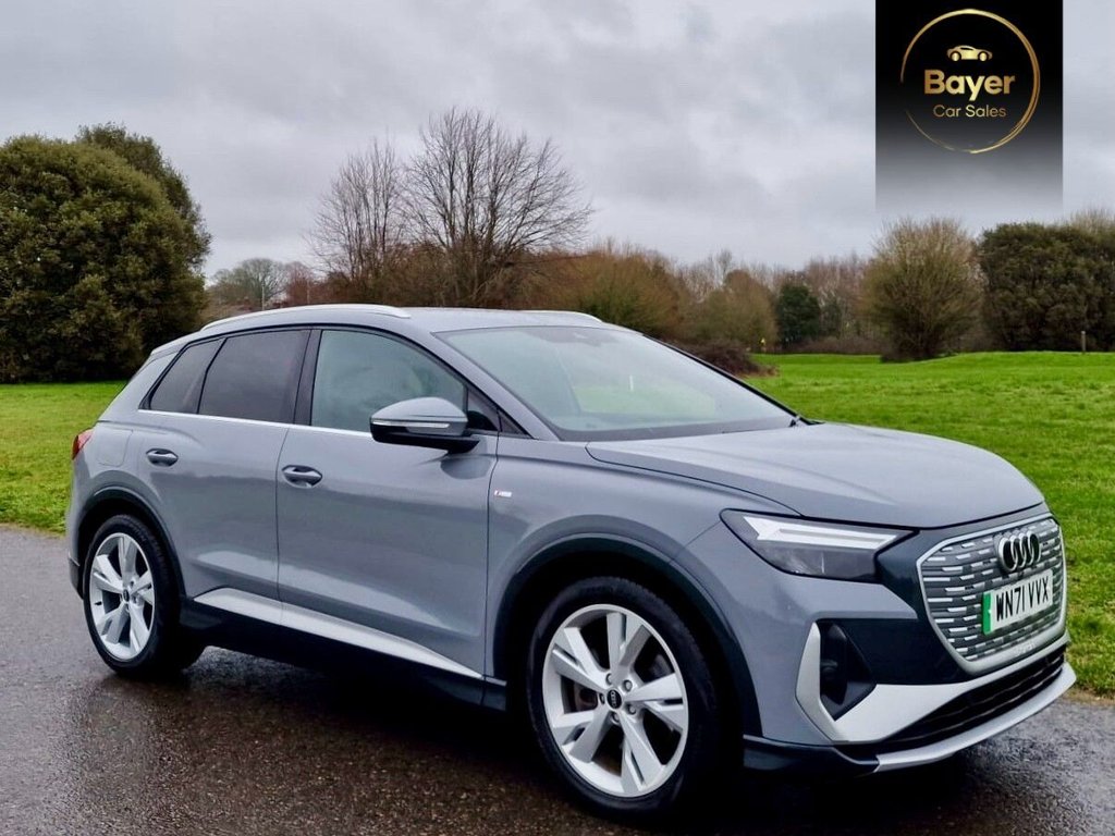 Fareham0 Previous Owners, GREAT VALUE VAT QUALIFYING This 2021 Audi Q4 etron S line boasts a single owner from new, offering a pristine example of this popular electric SUV. As an electric vehicle, it features an 82 kWh battery, providing a maximum range of 303 miles when new. This S line trim enhances the driving experience with desirable features such as heated front seats for comfort, a Bluetooth interface for seamless connectivity, and the Audi Smartphone Interface which supports both Android Auto and Apple CarPlay. For convenience, it includes rear parking sensors to aid manoeuvring and a 3zone electronic climate control system to ensure all occupants enjoy their preferred temperature. The Audi Q4 etron S line offers impressive charging capabilities, with a full charge at home using a 7kW charger taking approximately 11 hours and 30 minutes, ideal for overnight top ups. For faster charging on the go, it can reach 80% capacity from empty in just 30 minutes at a compatible public charging station. The highlighted maximum range of 303 miles demonstrates its suitability for both daily commutes and longer journeys, setting it apart as a practical and efficient electric vehicle choice. A little bit about us and how we work. We are a family business who have been supplying main dealerships for over 20 years. We have a very good supply of used cars that are in the main purchased directly from large PLC companies or main dealerships. We operate on a high turnover and small margin making our vehicles the best priced in the current market. With this in mind we don?t discount as we simply don?t have big margins to do so but more the fact we prefer to be completely transparent and believe everyone deserves to be offered the same great prices. We operate on an appointment basis so we can ensure the vehicle is ready. Please give us a call and pop in for a coffee..11 kW Onboard Charger, 135kW DC Charging Capability, 2 USBC Ports with Charge and Data Functions, 20in Alloy Wheels 5YSpoke, 3Zone Electronic Climate Control, 4Way Electric Lumbar Support for Front Seats, ABS AntiLock Braking System, AC and DC Charging access Point on the Rear Right, Active Vehicle Alerting System AVAS, Aluminium Look Interior Elements, Aluminium Roof Rails, Ambient Lighting Pack, Anti Theft Locking Wheel Bolts, AntiTheft Alarm, Audi Connect Navigation and Infotainment Services Plus (3 Year Subscription From New), Audi Connect Safety and Service ecall, Audi Drive Select, Audi PreSense Front with Pedestrian and Cyclist Recognition, Audi Smartphone Interface, Audi Sound System, Audi Virtual Cockpit 10.25in Display, Auto Dimming and Frameless Rear View Mirror, Bluetooth Interface, Body Coloured Door Mirrors, Camera Based Traffic Sign Recognition, Cloth Headlining in Black, Comfort Auxiliary Air Conditioning, Compact etron Charging System, Contrast Bumpers in Manhattan Grey Paint Finish, Cruise Control with Speed Limiter, DAB Digital Radio, Driver and Front Passenger Airbag with Front Passenger Airbag Deactivation, Electric Windows Front, Electronically Operated Child Locks, First Aid Kit and Warning Triangle and Safety Vests, Folding Door Mirrors with AutoDimming Function for Both the Drivers and Passengers Side Electrically Folding Adjustable and Heated with BuiltIn LED Side Indicators and KerbView Function for Passenger Side, Front and Rear Floor Mats, Front Centre Armrest, Front Door Sill Trims with Aluminium Inlay Illuminated with S Logo, Front Side Airbags with Head Level Airbag System and Front Interaction Airbag, Heated Front Seats, Household Plug Type G GB, ISize Child Seat Mounting on the Front Passenger Side and ISize and Top Tether on the Outer Rear Seat, Industry Plug CEE 32 A230 V Long and Straight, Inlays Darkened Matt Brushed Aluminium, Keyless Go, Lane Departure Warning, LED Headlights with LED Daytime Running Lights, LED Rear Lights, MMI Navigation Plus with High Resolution 11.6in Touchscreen Colour Display, Mode 3 Type 2AC Charging Cable 22kW, NonSmoking Package, Pebble Grey, Pedals in Stainless Steel, Power Operated Tailgate, Privacy Glass Dark Tinted Rear Window Rear Door Windows and Rear Side Windows, Progressive Steering, Projection Light in the Exterior Mirrors, Pulse ClothLeather Sport Seats with S Embossed Logo Black with Rock Grey Stitching, Rear Parking Sensors, S Line