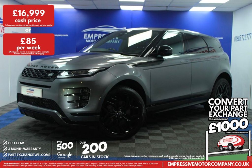 Merthyr TydfilInsurance Group 27, 2 Previous Owners, ****EXCELLENT EVOQUE**** Just in! This Stunning 2019 LAND ROVER RANGE ROVER EVOQUE 2.0 D150 RDynamic S SUV 5dr Diesel Auto 4WD Euro 6 (s/s) (150 ps) Finished In Grey! 60,017 Miles 20" Gloss Black Alloys R Dynamic Package Automatic LED Headlights 4X4 ATPC Electric Handbrake Hill Assist Parking Sensors Reversing Camera Automatic Paddle Shifters 2.0L Diesel Electric Powered Folding Mirrors Automatic Dual Control Climate Zone Stop Start Engine Full Leather Seats Heated Seats Heated Windscreen Electric Handbrake Voice Assistant Lane Assist Speed Limiter Cruise Control Automatic Window Wipers Bluetooth With Apple CarPlay.10Way Heated Electric Front Seats, 10in Touch Pro, 18in Alloy Wheels 5Split Spoke Style 5074 Gloss Sparkle Silver, 402040 Split Fold Rear Seat, ABS Anti Lock Braking System, Airbags Driver Knee, Airbags Front Driver and Front Passenger, All Season Tyres, Ambient Interior Lighting, Analogue Dials with Central TFT Display, Android Auto, Apple CarPlay, ATPC All Terrain Progress Control, AutoDimming Power Fold Heated Door Mirrors with Approach Lights, AutoDimming Interior Rear View Mirror, Automatic Headlights, Autonomous Emergency Braking, Black Gearshift Paddles, Bluetooth Connectivity, Body Coloured Roof, Brake Pad Wear Indicator, Bright Metal Pedals, Carpet Mats, Chrome Treadplates, Cruise Control and Speed Limiter, Customer Configurable Autolock, D150 Badge, DAB Digital Audio Broadcast, Driver Condition Monitor, DSC Dynamic Stability Control, EBA Emergency Brake Assist, EBD Electronic BrakeForce Distribution, Efficient Driveline, Electric Parking Brake, Electric Windows with OneTouch OpenClose and AntiTrap, EPAS Electronic Power Assisted Steering, ETC Electronic Traction Control, Evoque and RDynamic Badge, Flush Deployable Door Handles, Front and Rear Parking Aid, HDC Hill Descent Control, Headlining Ebony Morzine, Heated Rear Window with Timer, Hill Launch Assist, InControl Remote App, InControl Apps, Intrusion Sensor, Lane Keep Assist, Leather Steering Wheel, LED Headlights, Locking Wheel Nuts, Low Traction Launch, Manual Headlight Levelling, Manual Tailgate, Manually Adjustable Steering Column, Navigation Pro, Overhead Lighting Console, Overhead Stowage for Sunglasses, Passive Front Headrests, Passive Suspension, Power Operated Child Locks, Power Socket Pack 1, Pro Services and WiFi Hotspot, Push Button Start, RDynamic Exterior Pack, RSC Roll Stability Control, Rain Sensing Windscreen Wipers, Rear Air Vents, Rear Fog Lights, Rear ISOFIX, Rear View Camera, S Badge, Seat Belt Reminder, Seats Rear Centre Head Restraint, Shadow Atlas RANGE ROVER Bonnet and Tailgate Script, Side Curtain Airbags and Thorax, Smart Settings, Sound System, Standard Roof, Sun Visors Illuminated Vanity Mirrors, TPMS Tyre Pressure Monitoring System, Tailgate Spoiler, Terrain Response 2, Torque Vectoring, Traffic Sign Recognition and Adaptive Speed Limiter, Trim Finish Gradated Linear Dark Aluminium, Twin Front Cupholders with Cover, Twin Sliding Front Centre Armrest, TwoZone Climate Control, Tyre Repair System, Voic