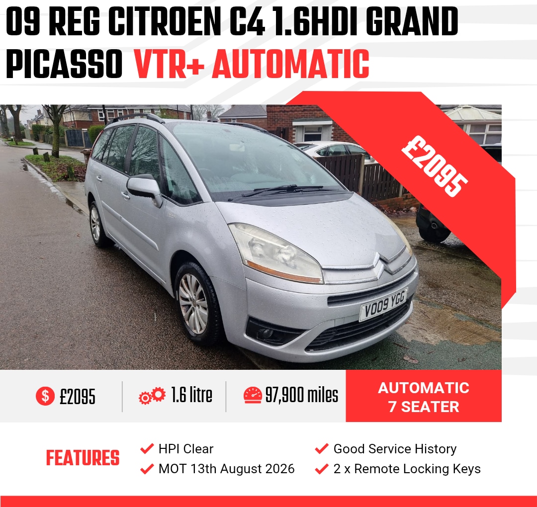 SheffieldInsurance Group 13, Partial Service History, £2095**AUTO**£2095**7 SEATS**£2095 09 REG CITROEN C4 1.6HDi GRAND PICASSO VTR+ AUTOMATIC 7 SEATER FAMILY MPV 97900 MILES WITH GOOD SERVICE HISTORY MOT 13TH AUGUST 2026 HPi CLEAR FULL REPORT COMES WITH SALE OF CAR 3MTH WARRANTY INCLUDED IN SCREEN PRICE 2 X REMOTE LOCKING KEYS 4 X ELECTRIC WINDOWS ELECTRIC FOLDING MIRRORS REAR WINDOW BLINDS BUILT IN REAR PICNIC TABLES LOADCOVER FOR WHEN YOU DON'T NEED 7 SEATS LOTS OF STORAGE AREAS CAR DRIVES FINE NO ISSUES ANY INSPECTION /TESTDRIVE WELCOME CAR BASED IN SHEFFIELD (DELIVERY AVAILABLE ) CALL O79OO458817 TO ARRANGE A VIEWING PART EX CONSIDERED AT TRADE VALUE ONLY PLEASE ASK FOR A QUOTE IF DELIVERY PREFERRED