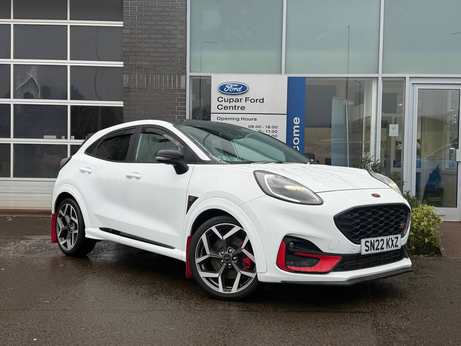 CuparInsurance Group 22, 1 Previous Owner, 3 rear seatbelts, Autonomous emergency braking, Child safety lock, Electronic stability control (ESC) and hill start assist, Pedestrian/cyclist detection and postcollision braking, Pre collision assist system, Red brake calipers, Tyre pressure monitoring system (TPMS), Cruise control with Intelligent speed assist, Driver impairment monitor, Emergency call service, Ford easy fuel, Front and rear parking sensors, Full digital 12.3 inch instrument cluster, Lane keeping aid with lane departure warning, Manual tailgate, Power assist steering, Selectable drive modes (normal, sport, eco, track), Speed sign recognition, Automatic headlights with auto high beam, Automatic rain sensing wipers, Body coloured door mirrors, Body coloured roof, Dual chrome exhaust, Fixed LED signature headlamps, Front fog lamps, Large rear spoiler, LED daytime running lights, LED rear lamps, Power foldable heated door mirrors with puddle lamps and puma logo protection, Premium paint, Privacy glass to side rear windows and tailgate glass, Quickclear heated windscreen, Rear side wing doors, Rear wiper, ST scuff plates, Third brake light, Unique ST body styling kit including wing mirrors and Ford Performance embossed splitter, 3 seat bench in 2nd row, Alloy sports pedals, Centre console with armrest and stowage, Ford megabox extended bootspace, Ford Performance sensico partial premium leather upholstery with metal grey stitching, Front and rear floor mats, Front and rear head restraints, Manual 6 way driver seat adjust with lumbar adjustment, Manual 6 way passenger seat with lumbar seat adjustment, Single front passenger seat, ST flat bottomed steering wheel with metal grey stitching, ST logo projection, Unique ST gear shift knob, Wireless charging pad with electronic air temperature control (EATC), BandO Premium Audio system + Ford SYNC 3 navigation pack Puma, Winter pack Puma, Engine sound enhancer, ST suspension, Carbon look interior deco spears, Keyless entry and power start button, Thatcham alarm, 19 inch 5 Spoke magnetite dark finished alloy wheel, Tyre inflation kit
