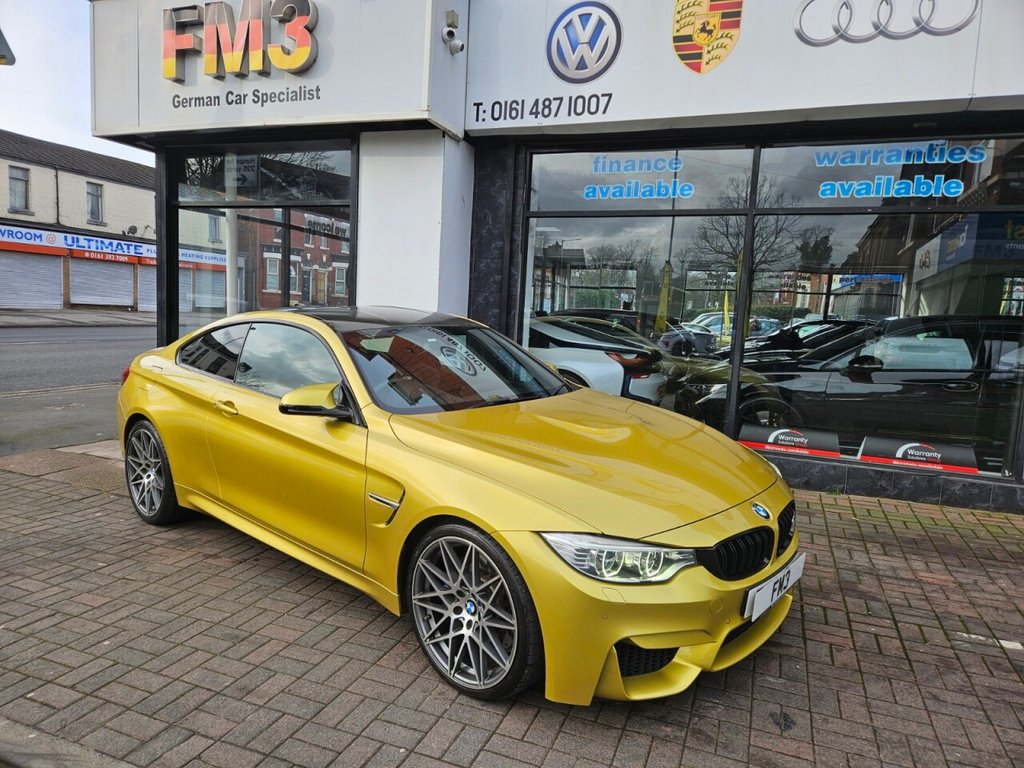 StockportWE AT FM3 Cars would like to offer you this excellent example of A BMW M4 3.0 BiTurbo, 2 Door, Coupe, 431 BHP, Finished in Metallic Austin YELLOW with Full Merino Black Leather Interior, CARBON ROOF, Interior Trim Carbon Fibre, SAT NAV HDD, Head Up Display, Reversing Camera, Reverse Camera, Heated Front Seats, Electric Memory Front Seat, Front and Rear Parking Sensors, Adaptive Head Light with High Beam Assist, Harman Kardon Upgraded Sound System, Bluetooth/DAB/RADIO/CD/USB, 20" M4 Competition Diamond Cut Alloys, Electric Heated Folding Mirrors, Service History, UK Main Land Delivery and Finance Options Available, Reserve this car today with only £199 Deposit. All of our cars come provided with a service and MOT. HPI reports are available for all vehicles. Warranties available, subject to suit each individual vehicle. We partner with a wide variety of finance companies, decisions can be made within 60 seconds. Drive your dream car away within 1hour. 5 day drive away insurance available at an additional cost. All part exchanges welcome. Tel; 0161 487 1007. We do take great care in describing the vehicle, its features and history, but errors can be made. Please feel free to ask the sales staff for any particular feature or detail you are not sure about before purchase, as this can not be rectified after purchase. .12V Power Socket in Front Centre Console and Passenger Footwell, 19in Alloy Wheels M Light Double Spoke Style 437M Ferric Grey, 20GB Memory, ABS Anti Lock Braking System, ASC Automatic Stability Control, Air Breather Body Colour, Air Conditioning Automatic Dual Zone, Airbags Curtain, Airbags Driver, Airbags Front Side, Airbags Passenger, Airbags Passenger Deactivation, Alarm Thatcham Cat 1 and Immobiliser, Armrest Front and Rear Integrated into Door Trim, Armrest Front with Storage Compartment, Automatically Dimming Rear View Mirror, Auxiliary Input, BMW ConnectedDrive Online Services, BMW Emergency Call, BMW Mobility System, BMW Professional Radio Single CD and MP3, BMW Remote Services, BMW TeleServices, Battery Safety Cut Off, Bluetooth Hands Free Facility, Bottle Holders Front Door Storage Compartments, Brake Assist, Brake Drying, Brake Pad Wear Indicator, Bumpers Body Colour, CBC Cornering Brake Control, Central Locking Remote, Comfort Go Keyless Start, Crash Sensor, Cruise Control with Brake Function, Cup Holders x2, DAB Digital Radio, DBC Dynamic Brake Control, DSC Dynamic Stability Control Plus, DTC Dynamic Traction Control, Daytime Driving Lights, Door Handles Body Colour, Door Mirrors Body Coloured Housing, Door Sill Finishers M Designation, Dynamic Brake Lights, Electric Windows Front Open and Close Fingertip Control, Enhanced Bluetooth Telephone Preparation with USB Audio Interface and Voice Control, Exhaust Tailpipes Quad Chrome, Extended Lighting, Exterior Mirrors Automatically Dimming Folding, Exterior Trim High Gloss Shadowline, First Aid Kit, Floor Mats Velour, Follow Me Home Headlight Function, Full Black Panel Display, Gear Knob Leather, Grab Handles in Roof Lining x4, Handbrake Leather, Head Restraints Intergrated Rear, Headlight BeamThrow Control Automatic Levelling, Headlight Wash, Headlights Auto On, Headlining M Anthracite, High Level Third Brake Light, Hill Start Assistant, ISOFIX Rear, Information Plus, Interior Lighting Front and Rear Centre, Interior Trim Blue Shadow, Interior Trim Finisher Black High Gloss, Kidney Grille Chrome with Double Black Vertical Slats, LED Tail Lights, Lightson Audio Warning, Luggage Compartment Lashing Eyes, Luggage Compartment Light, Lumbar Support Driver and Front Passenger, M Aerodynamic Bodystyling, M Dynamic Mode, M Instrument Cluster, M Rear Spoiler, Media Package BMW Professional, Navigati