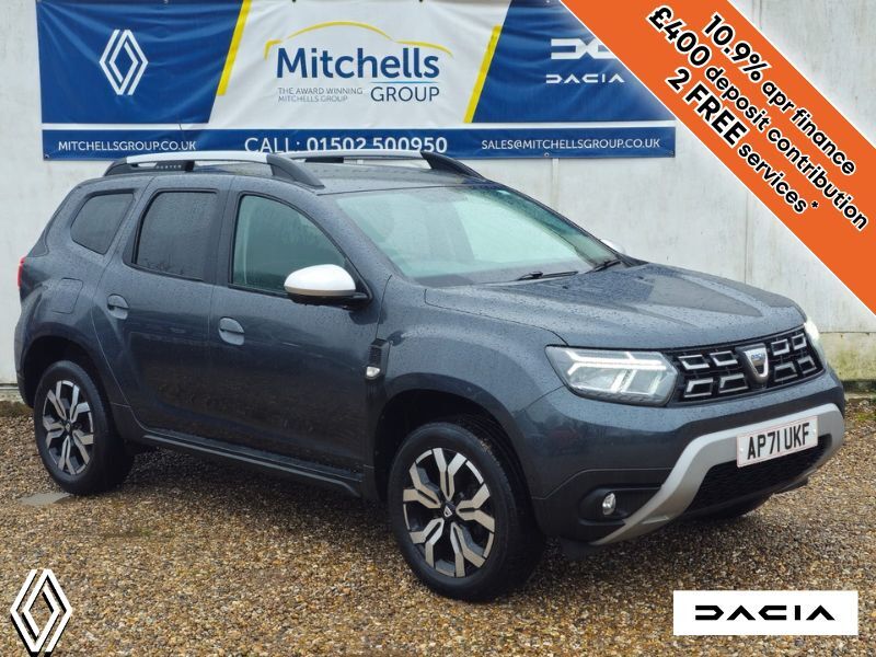 LowestoftInsurance Group 12, 0 Previous Owners, ..4x4 monitor with altimeter, Blind spot warning, Compass functional at 0km/h, Cruise control and speed limiter, Dacia instrument cluster, eCall emergency system, Eco mode, Electric power assisted steering, Multi view camera, On board computer, odometer, trip computer, average fuel consumption, average speed, service indicator, outside temperature gauge, Rear parking sensors and reverse camera, Rev counter, Stop/start system, 8'' Media Navigation with wireless smartphone replication, Dacia plug and radio/MP3/USB/bluetooth/DAB/steering wheel control, 3 speed windscreen wipers, Acoustic windshield, Black side sills, Black/satin chrome tailgate trim with Duster inscription in black background and lettering, Body coloured door handles, Chrome front grille with hot stamping, Chrome logo surround on steering wheel, Dark glass on lateral rear windows, Dusk sensor, Electric adjustable/heated door mirrors, Electric front windows, Electric rear windows, Front and rear body coloured bumpers, Front door sill protection strip, Front fog lights, Grey quartz longitudinal roof bars with Duster inscription, Grey quartz painted door mirrors, Heated rear window, High level third rear brake light, LED automatically switched on In main headlights, LED daytime running lights, Rain sensor, Rear side wing doors, Rear spoiler, Rear wash/wipe, Underbody protection skid plates, Y shaped LED headlights with rear LED lights, 3 rear height adjustable headrests, 3 seat bench in 2nd row, 60/40 split folding rear seat, Automatic air conditioning, Backlighted steering wheel buttons, Boot light, Driver seat lumbar adjustment, Fabric decorative insert on door panels, Fabric upholstery, Front head restraints, Front passenger reading light, Gear shift indicator, Glovebox light, Heated seats, Height adjustable driver seat, Height adjustable front and rear headrests, Height and depth adjustable steering wheel, High centre console with driver armrest, Isofix points for child seats in both outer rear seats, Map pocket on front seat backs, Passenger sunvisor with vanity mirror, Rear passenger reading light, Satin chrome gear lever cap insert, Satin chrome interior door handles, Satin chrome lower steering wheel insert, Single front passenger seat, Soft feel leather steering wheel, 3x3 point rear seatbelts, ABS and Emergency brake assist, ASR traction control with Electronic stability control, Child locks on rear doors, Door open visual and audible warning, Driver airbag, Driver and passenger