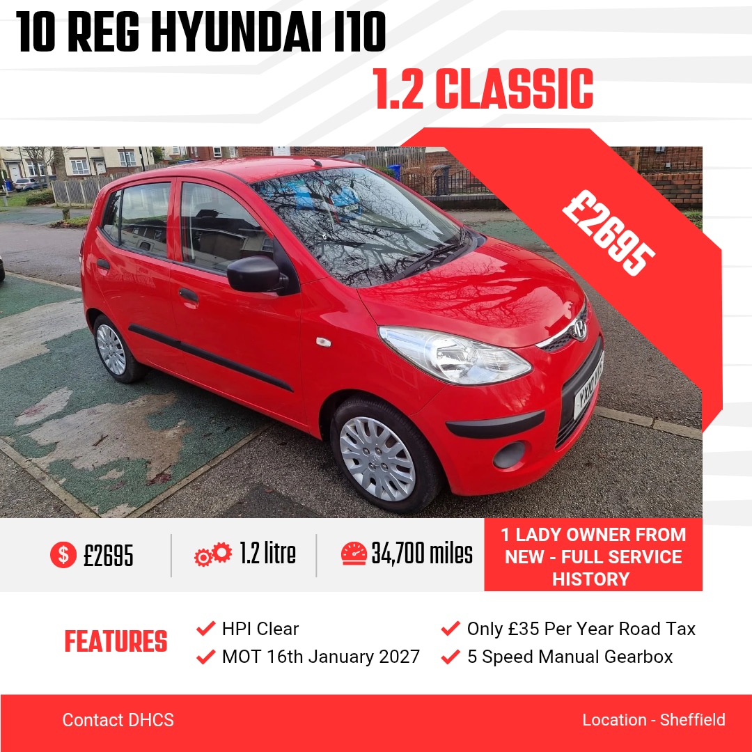 Insurance Group 10, 0 Previous Owners, Full Service History, £2695**F/S/H**£2695**34K MILES**£2695 10 REG HYUNDAI i10 1.2 CLASSIC 5 DOOR SMALL HATCHBACK 5 SPEED MANUAL GEARBOX 1 LADY OWNER FROM NEW (V5 NONE FORMER KEEPERS) ONLY COVERED 34700 MILES WITH FULL HISTORY MOT 16TH JANUARY 2027 £35 ROAD TAX PER YEAR 3 MTH WARRANTY INCLUDED IN SCREEN PRICE FULL CLEAR HPi REPORT COMES WITH SALE OF CAR 2 X KEYS CENTRAL LOCKING FRONT ELECTRIC WINDOWS RADIO / CD PLAYER / AUX PLUG IN CAR IS IN GREAT CONDITION INSIDE & OUTSIDE ANY INSPECTION / TESTDRIVE WELCOME CAR BASED IN SHEFFIELD (DELIVERY AVAILABLE ) CALL O79OO458817TO ARRANGE A VIEWING PART EX CONSIDERED AT TRADE VALUE ONLY ** PLEASE ASK FOR A QUOTE IF DELIVERY PREFERRED **