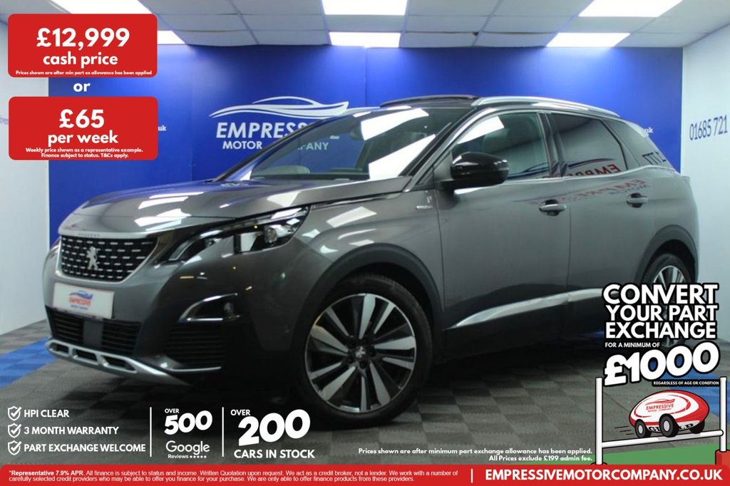 Merthyr TydfilInsurance Group 17, 0 Previous Owners, ****PERFECT PEUGEOT**** Just in! This Stunning 2019 PEUGEOT 3008 1.5 BlueHDi GT Line Premium SUV 5dr Diesel Manual Euro 6 (s/s) (130 ps) Finished In Grey! 62,751 miles 1.5L diesel 6 speed manual 19" diamond cut wheels Automatic led headlights Parking sensors Reverse camera Sliding panoramic sunroof Powered tailgate Half leather heated seats Ambient lighting Sport mode Touch media screen with sat nav Bluetooth connectivity with apple car play USB Wireless phone charging Automatic 2 zone climate control Lane assist Start stop Blind spot monitoring Traction control Electric handbrake Voice control Cruise control Speed limiter Auto wipers Electric folding mirrors .13 23 Folding Rear Seat Magic Flat Modularity with Controls Accessible From the Boot, 12V Sockets x3 Dashboard Rear Cabin and Load Area, 180 Degree Colour Reversing Camera with Wash System, 19in Alloy Wheels Washington Diamond Cut Two Tone, 230V Socket, 3D Connected Navigation, 6Speaker Radio MP3 Compatible, ABS AntiLock Braking System with REF Electronic Braking Distribution and AFU Emergency Braking Assistance, Aikinite Contrast Stitching to Armrest Gear Lever Gaiter and Dashboard Facia, Air Conditioning Automatic Dual Zone Climate Control, Airbags Adaptive Driver and Front Passenger, Airbags Driver and Front Passenger Side, Airbags Front and Rear Curtain, Alarm, Aluminium Longitudinal Roof Bars, Automatic Door Locking When Moving Off, Automatic Hazard Light Activation Upon Heavy Brake Application, Blue Ambient Lighting for Connecting Zone, Blue Ambient Lighting to Front Door Panels Central Storage and Cupholders, Blue Ambient Lighting to HeadUp Instrument Panel, Bluetooth Telephone Facility, Body Protectors in Black, Central Front Armrest with ButterflyWing Opening and Illuminated Compartment, Chrome Front Fog Light Trim, DAB Digital Radio, Dark Tinted Rear Side and Tailgate Windows, Dashboard Front and Rear Door Panel Finish Brumeo Fabric, Dashboard Trim Satin Chrome, Door Mirror Mounted LED Peugeot Lion Approach Lights, Door Mirror Shells Nera Black, Driver Sport Pack, DSC Dynamic Stability Control and ASR Electronic AntiSkid System, Electric Child Locking Functionality on Rear Windows and Doors, Electric Parking Brake includes Hill Assist, Electric Power Steering with Reach and Rake Adjustable Steering Column, Electronic Code Immobiliser, Exterior Door Handles BodyColour, Exterior Temperature Indicator with Ice Warning, Fixing Rings x4 in Load Area, Flocked Front Door Pocket Interior, Flocked Glove Box Interior, Front and Rear Parking Sensors, Front Bumper Scuff Plate in Lion Grey, Front Central Console with Two CupHolders, Front Door Panel Recess Trim Satin Chrome, Front Interior Light with Reading Spotlights x2 and Rear Interior Light with Timer, Front Optimised Safety Headrests and Rear Retractable Headrests x3 HeightAdjustable, Front ThreePoint Retractable Seatbelts HeightAdjustable with PreTensioners and Force Limiters, Front Windscreen Wiper with Magic Wash Cleaning System, Front Wing Trim Black with Chrome Detail, Full LED Headlights, Gear Lever Satin Chrome, Gear Shift I