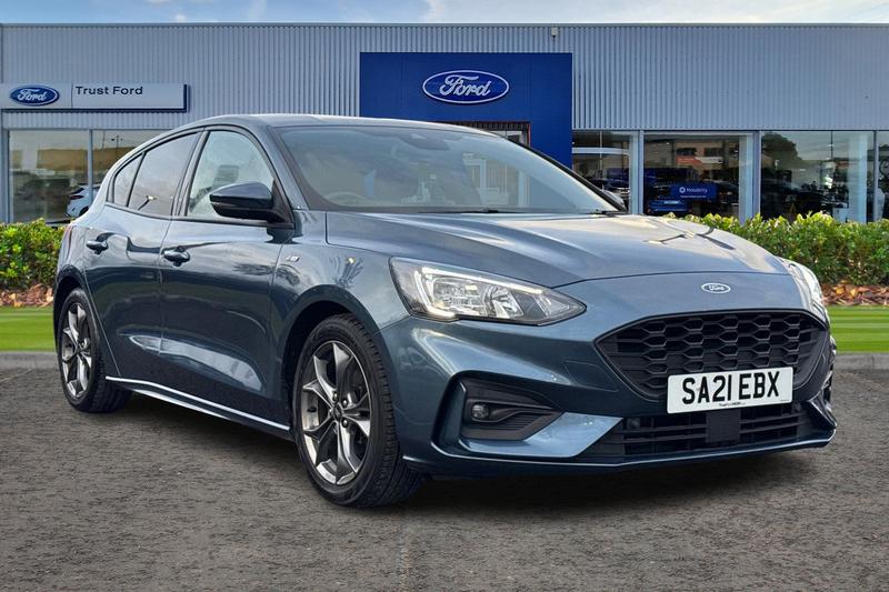 CastlefordInsurance Group 14, Satellite Navigation System, Tyre pressure monitoring system, Cruise Control + Speed Limiter, 'Quickclear' heated windscreen/heated washer jets, Bluetooth system, Digital clock, Easy fuel capless refuelling system, Eco mode, Ford pass connect, and app link Android auto/Apple carplay, Lane keeping aid with lane departure warning, PAS, Selectable drive mode, Trip computer, Auto headlamps (on/off), Body colour large rear spoiler, Body colour side skirt, Body coloured bumpers, Body coloured door handles, Body coloured electrically operated and heated door mirrors with side indicators, Electrically operated front and rear windows with one touch opening and closing, Front variable intermittent wipers with electric wash, Halogen reflector headlamps, Heated rear window, LED daytime running lamp, LED front fog lamps with cornering function, Polished twin tailpipe, STLine upper and lower grille with full body styling kit and wing badges, Tailgate wash/wipe, 3 spoke flat bottomed leather steering wheel with red stitching, 60/40 split back and cushion rear seats with 2 height adjustable headrests, Alloy finish pedals, Aluminium gear knob, Centre console with armrest, Cloth upholstery with red stitching, Dark headliner, Driver's lumbar support, Front floor mats, Height adjustable front headrests, Isofix child seat preparation, Manual air conditioning, Reach + rake adjustable steering column, Rear centre headrest, ABS+Electronic Brake force Distribution, Auto hold function, Driver airbag,