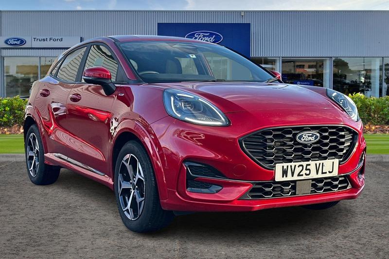 Insurance Group 13, Driver impairment monitor, Emergency call service, Ford easy fuel, Full digital 12.8 instrument cluster, Lane keeping aid with lane departure warning, Power assist steering, Selectable drive modes(Normal, Eco, Sport, Slippery and Trail), Speed sign recognition, Automatic headlights with rain sensing wipers and auto high beam, Front fog lamps, LED daytime running lights, LED rear lamps, LED third brake light, Power foldable heated door mirrors with puddle lamps and puma logo protection, Quickclear heated windscreen, Rear privacy glass, Rear side wing doors, Rear wiper, STLine body styling kit with unique grille, 3 seat bench in 2nd row, Centre console with armrest and stowage, Electronic automatic temperature control (EATC), Ford megabox extended bootspace, Front and rear head restraints, Front floor mats, Manual 4 way driver seat adjust with lumbar adjustment, Single front passenger seat, ST Line cloth trim with red stitching, 3 rear seatbelts, Child safety lock, Electronic stability control (ESC) and hill start assist, Precollision assist with autonomous emergency braking, pedestrian/cyclist detection & postcollision braking, Tyre pressure monitoring system (TPMS)