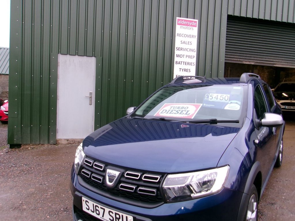 New PitsligoInsurance Group 9, 1 Previous Owner, Diesel Dacia Sandero Stepway DCI 1461cc Reg 19/9/17 MOT 5/2/27 NO ADVISORIES 5 Dr Blue ULEZ Compliant 1 Previous Lady Owner Last 5 Yrs 2 Keys Sold with NEW SERVICE and Warranty ONLY £5450 Part Exchange Welcome Choice Dacias Engine Sizes Colours ETC Warranties Available with Momentum Warranties ask for details Email or Phone or POP In past Aldersyde Motors New Pitsligo AB43 6NN For test drive if unable to come for test drive can arrange to meet you ulez Compliant Aldersyde Motors New Pitsligo AB43 6NN Email or Phone or Pop in past ONLY 45 Minutes from Aberdeen APPROVED FINANCE DEALER Cards Accepted A Member of FSB A SELECTION of LOW TAX and INSURANCE GROUP MOTORS IDEAL FIRST MOTOR Warranties with Momentum Warranties.12V Power Socket, 12V Socket for Rear Passengers, 16in Steel Wheels Stepway Design, 3Point Rear Seatbelts x3, 3Speed Front Windscreen Wipers, AUX Input, Air Recirculation 4speed Heating and Ventilation, Air Vents Satin Chrome, Airbags Driver, Airbags Front Passenger with Deactivation Function, Airbags Front Side, Antiintruder Automatic Doorlocking System, Antilock Braking System ABS and Emergency Brake Assist EBA, Bluetooth Connectivity, Boot Light, Bumpers Front and Rear Body Coloured, Central Console Surround Satin Chrome, Central Locking Remote, Child Locks in Rear Doors, Chrome Front Grille, DABFMAM Radio, Door Handles Black, Door Mirrors Manually Adjustable, Door Mirrors Metal Grey, Door Open Visual Warning, Door Panels TwoTone Dark CarbonLight Grey, EBD Electronic Brakeforce Distribution, ECO Mode, ESC Electronic Stability Control with ASR Traction Control and Hill Start Assist HSA, Electric Windows Front, Fog Lamp Embellisher Satin Chrome, Front Courtesy Light, Front Fog Lights, Front Passenger Grab Handle, Gear Shift Indicator, Headlights Double Optic with Chrome Surrounds, Headlights Left On Audible and Visual Warning, Headrests Rear Height Adjustable x3, Heated Rear Window, HeightAdjustable Drivers Seat, HeightAdjustable Front Headrests, HeightAdjustable Front Seatbelts, HeightAdjustable Steering Wheel, High Level Third Brake Light, ISOFIX Points for Child Seats in Both Outer Rear Seats, Instrument Dial Surrounds Satin Chrome, Interior Door Handles Front Satin Chrome, Interior Door Handles Rear Satin Chrome, LED Automatic Daytime Running Lights, Manual Air Conditioning, Manual Windows Rear, Map Pockets on Front Seatbacks, Power Assisted Steering, Raised Ride Height, Rear Passenger Grab Handles, Rear WasherWipe, Rev Counter, Roof Bars Satin Chrome, Seatbelt not Fastened Visual and Audible Warning, Seats 6040 Split Folding Rear, Side Sills Black, Skid Plates Front and Rear Satin Chrome, Stepway Logo on Front Door Panel, Sunvisor with Vanity Mirror Passenger, Thatcham Approved Engine Immobiliser, Tinted Windows, Tyre Inflation Kit, Tyre Pressure Monitor, USB Connection for MP3 Players, Wheelarch Extensions, Cosmos Blue