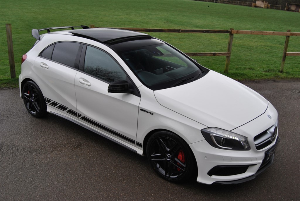 Horsham1 Previous Owner, Stunning Mercedes A45 AMG 5 Door Hatchback DCT 4Matic Euro 6 finished in Calcite White with Black Leather / Alcantara Performance Seats and a Aero Styling Pack. 46.000 miles with a full service history including a full service within the last 100 miles. Active park assist Interior and exterior mirror auto dimming AMG performance steering wheel Rain sensor Panoramic sliding glass sunroof 7 speed automatic dual clutch transmission Electric folding outside mirror Traffic sign recognition Command DVD aps with Navigation Digital radio standard DAB Attention assist (drowsiness detection) AMG performance seats Automatic climate control Bi xenon headlamps for left hand traffic 18 inch AMG spoke wheels Calcite white standard finish AMG styling package front spoiler, side skirt Dark tinted glass Heated front seats Sensor system and anti theft alarm system Euro 6 4 matic all wheel drive Mirrors package Theft protection package AMG night package, exterior Illuminated door sill Floor mats AMG Illumination package Brake calipers painted red A fantastic looking car with good specification. ULEZ COMPLIANT NO CHARGE James Paul Car Sales is a family run business in a small village of Bucks Green conveniently situated on the Surrey and Sussex border. Established for over 35 years every car we offer is carefully hand selected and will come with a comprehensive provenance check. All of our vehicles are subject to a thorough pre delivery inspection through our workshops including a fresh MOT and service where required. Please ask us about our extremely competitive finance packages or Visit our website www.jamespaul.co.uk to create your own Finance Quote and Apply to help you fund your new car. Part exchanges welcome either way if you are looking to trade up or down. Please note that we do not accept reservations on cars via third party sites, if you wish to put a deposit on a car, please call 01403 823723 and speak to a member of the James Paul Car Sales team.. 12V Socket in Front Centre Console,18in Alloy Wheels 5 Twin Spoke Design,5.8in Colour Display,ABS AntiLock Braking System,AMG Bodystyling,AMG Drive Unit with Leather Trimmed Gear Shift,AMG Instrument Cluster with Colour Display and AMG Menu,AMG Performance Seats Contoured Seat Shape/Integrated Heas Restraints/AMG Badge in Seat Backrests,AMG Radiator Grille 2 Louvres in Silver Chrome,AMG Speed Sensitive Sports Steering with Variable Steering Ratio,AMG Sports Suspension,ASR Acceleration Skid Control,ATTENTION Assist,Active Bonnet Pedestrian Safety which Detects an Impact and Raises Bonnet,Active Park Assist with Parktronic,Adaptive Brake Lamps,Adaptive Brake System with Hold FunctionHill Start Assist,Air Vents with Chrome Surround and Red Inserts,Airbags Drivers Kneebag,Airbags Dual Stage Driver,Airbags Dual Stage Front Passenger,Airbags Front Sidebags,Airbags Head for Driver and Passenger,Airbags Window,Alarm System with Immobiliser and Interior Protection,Ambient Lighting,Automatic Child Seat Recognition Sensor,BAS Brake Assist,Beltline Strips Black,Bluetooth Interface,Bumpers Body Coloured,Centre Armrest Front with Storage,Childproof Locks Manually Operated for Rear Doors and Electrically Operated for Rear Power Windows,Collision Prevention Assist,Controller on Centre Console with Chrome Surround,CrashResponsive Emergency Lighting,Cup Holder Twin,Daytime Running Lights LED,Direction Indicators with OneTouch Control,Door Handles Body Coloured,Door Mirrors Electrically Adjustable and Heated with LED Indicators,Door Mirrors HighGloss Black,Door Sills AMG Illuminated,Driver and Front Passenger Seat HeightAdjustable,ESP Electronic Stability Programme,Electric Parking Brake,Electric Windows 4,Exhaust System Twin Visible Tailpipes,First Aid Kit and Warning Triangle,Floor Mats AMG,Fluid Level Warning Indicator OilCoolantWasher Fluid,Front Apron with Splitter in HighGloss Black,Front Footwell Lighting,Front Seat Comfort Package,Headlamp Assist Automatic Headlamp Activation,Headlight Wash System,Headlights Bi Xenon,High Level Third Brake Light LED,ISOFIX and TopTether Child Seat Fixing Points in Rear,Illuminated Glove Compartment,LED Rear Tail Lights,LED Tail Lights,Lamp Failure Indicator,Load Securing Rings in Luggage Compartment,Luggage Compartment Cover,Lumbar Support,Luxury Automatic Climate Control,Outside Air Temperature Gauge,Parking Sensor Front,Parking Sensor Rear,Pollen Filter,PreWiring for Becker Map Pilot Navigation System,Privacy Glass,Radio Aerial Integrated into Roof Spoiler,Rain Sensing Windscreen Wipers,Rear Apron Trim in HighGloss Black,Rear Seats Split Folding 13 23,Rear Windscreen Heated with Timer Control,Rear Windscreen Wiper,Remote Boot Release,Remote Central Locking,Roof Lining Black,SPEEDTRONIC Cruise Control,Seat Belts Reminder Front and Rear,Seat Occupancy Sensor Front Passenger Seat,Seats Cushion Angle Adjustment for Front,Shoulderline in