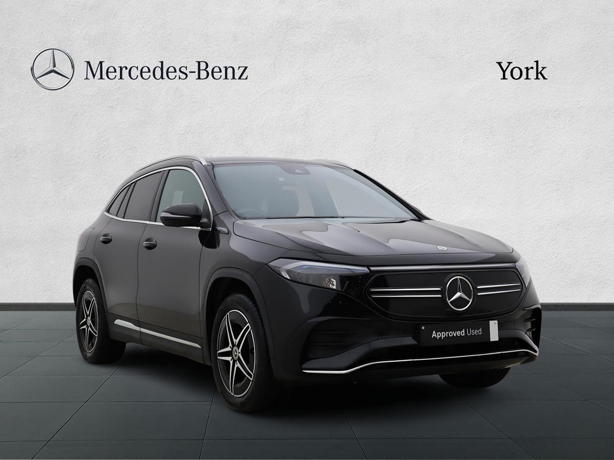 Insurance Group 37, 0 Previous Owners, Acoustic ambient protection, DYNAMIC SELECT with a choice of driving modes (max range, ECO, comfort and sport), Easypack tailgate, EQ navigation services map (range display), display charging stations, programming of charging settings and pre entry climate control, Harddisk navigation, Mercedes Benz emergency call system, Mercedes me connect, Service indicator, Smartphone integration with Apple CarPlay and Android auto, Trip computer, 100KW DC onboard charger, 11KW onboard charger, Charging cable for domestic plug socket, Type G (Mode 2) 5m, Charging cable for wall box and public charging station Type 2(mode 3) 5m, Combined charging system CCS2 connector, Comfort suspension, DAB Digital radio, MBUX multimedia system with 10" Digital instrument cluster and 10" media display with touchscreen, Mercedes benz sound system, 3rd brake light, AMG Line bodystyling including AMG front apron with integrated air curtain and AMG rear apron with diffusor optics, Black panel radiator grille with twin blade design in chrome, Body colour bumpers, Daytime running lights, Electric front windows, Electric rear windows, Front and rear LED light band, Front fog lights, LED High performance headlamps with adaptive highbeam assist, Polished aluminium roof rails, Privacy glass heat insulating dark tinted glass, Rain sensor windscreen wipers, Rear wing door, Rear wiper, Surround lighting with projection of brand logo, 3 seat bench in 2nd row, 3 spoke AMG multifunction sports flat bottom steering wheel in nappa leather with galvanised shift paddles, 40:20:40 split folding rear seats, Ambient lighting with choice of 64 colour settings, AMG brushed stainless steel sports pedals with aluminium rubber studs, AMG sports seats, Artico manmade leather/ Dinamica microfiber upholstery, Double Cupholder, Front and rear head restraints, Heated front seats, Illuminated door sills with EQA lettering, Reach and rake adjustable steering column, Rear armrest with storage + through load, Roof lining Black fabric, Single front passenger seat, Stowage compartment with retractable cover, THERMOTRONIC automatic climate control, Velour floor mats with AMG lettering, Interior light package EQA, Mirror package EQA, Parking package with reversing camera EQA, Seat comfort pack EQA, Stowage package EQA, 3 rear seatbelts, 6 airbags Driver, front passenger, curtain and side airbags, ABS, Child locks on rear doors, ESP, Isofix child seat anchor points on outer rear seats, Knee bags,