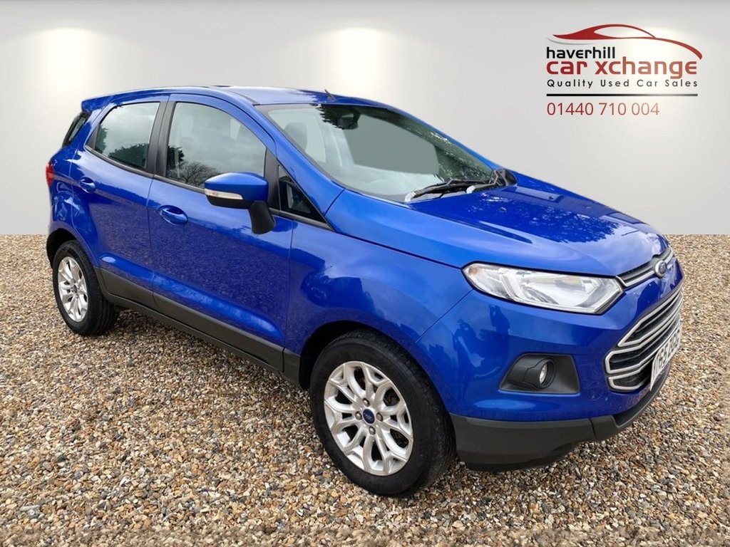 HaverhillInsurance Group 9, 1 Previous Owner, 62,534 MILES ONLY+THIS VEHICLE WILL COME WITH A NEW 12 MONTH MOT+RADIOCDMP3 PLAYER+AIRCONDITIONING+DAYTIME RUNNING LIGHTS+PARKING ASSISTANCE+METALLIC KINETIC BLUE PAINT+16 INCH ALLOY WHEELS. At Haverhill Car Xchange we would like to offer you our Ford Eco Sport Zetec SUV which has been finished in a metallic Kinetic Blue paint with Charcoal cloth upholstery. Specification Includes RadioCDMP3 Player, AUX Connection, USB Connection,12 Volt Power Socket, AirConditioning, Front and Rear Electric Windows, Body Coloured Bumpers/Door Handles and Door Mirrors with Integrated Side Indicators, Silver Front Grille, Front and Rear Skid Plates, Daytime Running Lights, Front Fog Lights, Rear Parking Assistance, Leather Steering Wheel with Mounted Audio Controls, 16 Inch Alloy Wheels, Power Assisted Steering, ABS Breaking System, Airbags, Alarm and Remote Central Locking. *** WE ARE OPEN 7 DAYS A WEEK *** ** UPTO 100 CARS IN STOCK **.Kinetic Blue, Radio CD Player MP3 Compatible, Air Conditioning Manual, Parking Sensor Rear, Front & Rear Skid Plates, Parking Sensor Rear, Cloth Charcoal, Kinetic Blue, 12V Power Socket Front, 16in Alloy Wheels, ABS Antilock Braking System, AUX Connection, Air Conditioning Manual, Airbag Front Passenger, Airbags Curtain, Airbags Passenger Deactivation, Airbags Side Impact, Armrest Drivers, Card Holder, Cup Holder, DDS Deflation Detection System, Daytime Running Lamps, Door Handle Integrated in Rear Light, Door Mirrors Electrically Operated and Heated, Drivers Airbag, EBA Emergency Brake Assist, EBD Electronic Brakeforce Distribution, ESP Electronic Stability Programme, Electric Windows Front and Rear, Floor Mats Carpet Front and Rear, Front Fog Lights, Front Grille Silver, Front Skid Plates, Glovebox Cooled, Handbrake Cover Leather, Pollen Filter, Power Assisted Steering, Radio CD Player MP3 Compatible, Rake Adjustable Rear Seat, Rake and Reach Steering Adjustable, Rear Skid Plates, Remote Central Locking, Seats 6040 Rear Split Back, Seats Drivers Lumbar Support, Seats Drivers Manual Height and Tilt Adjustment, Slide Out Drawer Under the Front Seat, Spare Wheel with Cover Alloy, Steering Wheel Audio Controls, Steering Wheel Leather, Stowage Pockets Front Seatback, Sunglasses Holder, Thatcham Category 1 Alarm, Traction Control TC, Trip Computer, Tyre Pressure Monitoring System, USB Connection