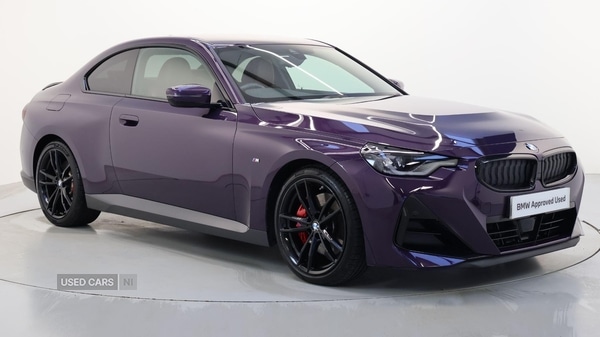 Coleraine1 Previous Owner, This 2023 BMW 2 Series 220d M Sport is a prime example of modern driving, boasting a sophisticated 2.0L Diesel Hybrid engine and meeting the Euro 6 emission class. As a 220d M Sport variant with the M Sport trim, it offers a dynamic driving experience. This particular model comes equipped with the M Sport Pro Pack, which includes a Premium Branded Sound System for your listening pleasure. The Technology Pack enhances convenience with Parking Assistance featuring front and rear sensors, a rear camera, and Wireless Phone Charging. Furthermore, the Comfort Pack adds Keyless Entry, Seats with Memory function, and a Heated Steering Wheel, complemented by Front Lumbar Support for added comfort.The inclusion of Mild Hybrid Technology in this BMW 2 Series signifies its advanced engineering, contributing to improved efficiency. This vehicle also benefits from a low insurance group, making it a more economical choice for many drivers. These highlighted features collectively demonstrate how this BMW 2 Series 220d M Sport offers a superior and more refined experience compared to other vehicles in its class. Mild Hybrid Technology, Tyre Repair Kit, Variable Sport Steering, Alarm System, Highgloss Black Interior Trim, Ambient Lighting, Ext. mirrors folding with antidazzle, Rearview Mirror with Auto dimming, Deletion lumbar support/width adjustment, Backrest width adjustment, Extended storage, Heated front seats, HighBeam Assistant, Active Guard Plus, Rear Folding Headrests, Automatic Air Conditioning, Cruise Control, Adaptive LED Headlights, BMW TeleServices, BMW Emergency Call, BMW Online Services, Connected Package Pro (limited duration), Deletion of iDrive touch function, Live Cockpit Professional, DAB Radio, M Sport Suspension, M Sport Exterior Styling, Highgloss Shadowline Exterior Trim, Anthracite Headlining, Active Pedestrian Safety, Special Steering Bluetooth Wifi, M Sport Package, Deletion of HeadUp Display, 19'' 791 M Doublespoke Alloy Wheels, Sport Automatic Transmission with Gearsh, Heated Steering Wheel, BMW Individual Lights Shadow Line, M Sport Brakes with Red Calipers, Comfort Access, M Sport Seat Belts, Sun Protection Glass, Electric Memory Seats, Front Lumbar Support, Parking Assistant, Enhanced Bluetooth wireless charging, WiFi Hotspot, Harman/Kardon Surround Sound Audio, Indv. highgloss shadowline extended, M Sport Spoiler Highgloss Black, Comfort Pack, M Sport Pro Pack, Technology Pack, M Sport Pro Pack. Purple 4 seats. BMW Approved