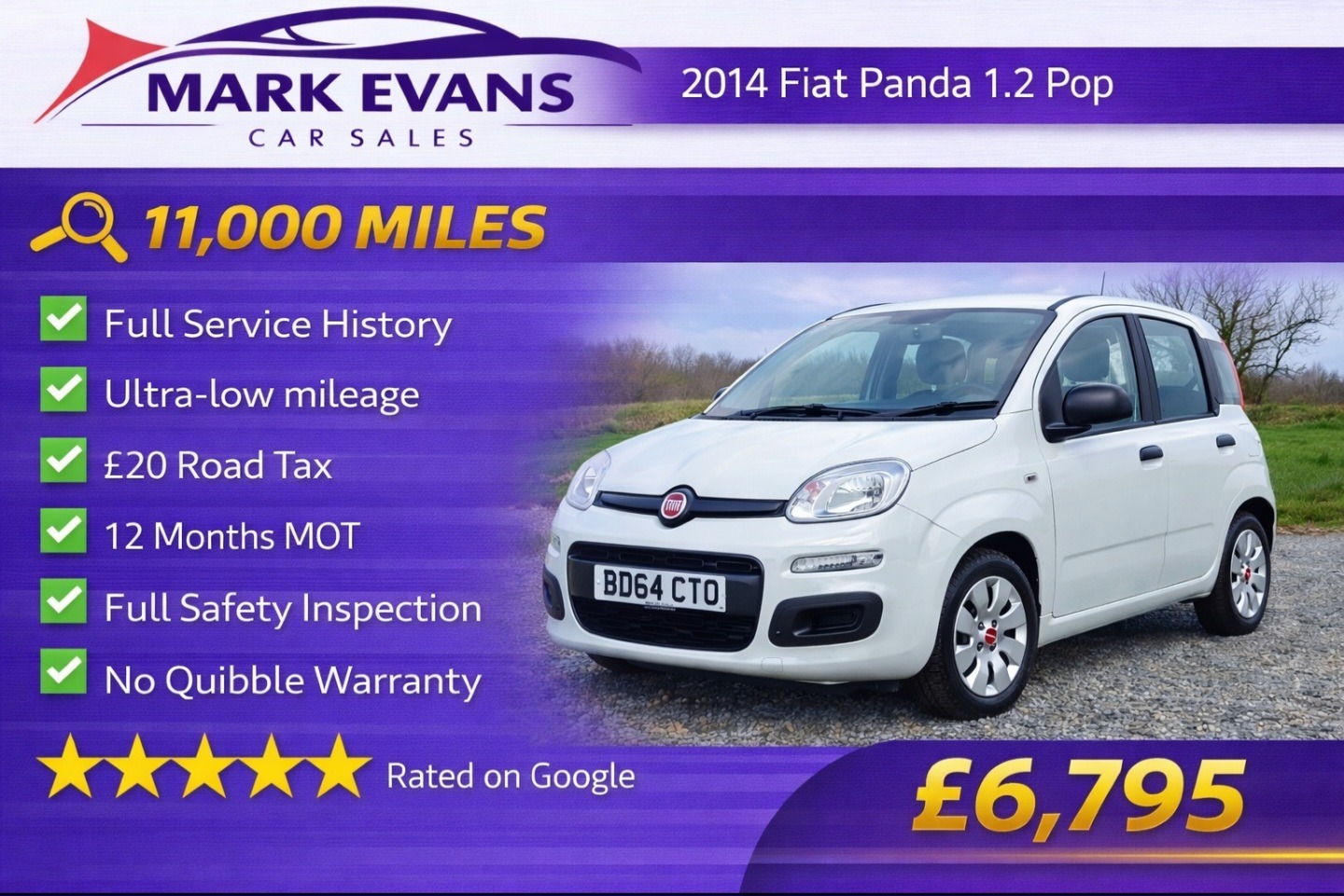 St AgnesInsurance Group 3, Only 11,000 MILES FULL SERVICE HISTORY £20 ROAD TAX..... This Fiat Panda 1.2 Pop has covered just 11,000 MILES from new and comes with a FULL SERVICE HISTORY. It is an exceptionally rare ULTRA LOW MILEAGE example, presented in superb condition both inside and out, clearly reflecting the care it has received throughout its life. Vehicles with mileage this low are increasingly difficult to find and represent a unique opportunity...... The vehicle will be supplied with a brand new 12 month MOT, a no quibble warranty, a full professional valet and a complete safety inspection, providing total peace of mind..... Powered by the dependable and economical 1.2 petrol engine, the Panda offers smooth and reliable performance along with very low running costs and just twenty pounds road tax. Well known for its simplicity, practicality and ease of driving, it is ideal as a first car, town runabout or economical everyday vehicle. Despite its compact size, it provides a surprisingly spacious interior and excellent visibility, making it easy and comfortable to live with......At just £6795, this exceptional low mileage Fiat Panda represents outstanding value and is a rare opportunity to purchase such a well maintained example....... We specialise in sourcing the very best low mileage high quality vehicles. Mark Evans Car Sales is based in St Agnes Cornwall TR5 0PA. We pride ourselves on our honesty integrity and five star service. Please take a moment to read our five star Google reviews, we are very proud of them. The Evans family has been in the motor trade in Cornwall for over 50 years and we continue to work hard to uphold our reputation for quality and trust.