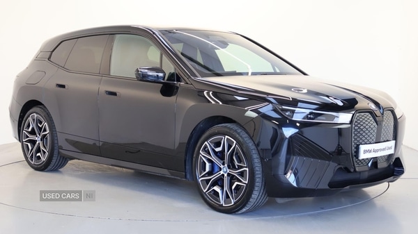 Coleraine0 Previous Owners, This 2022 BMW iX 50 M Sport is a remarkable example, having had only one owner since new. As a fully electric vehicle with Four Wheel Drive, it offers a sophisticated driving experience. This M Sport variant boasts a substantial 112 kWh battery, providing an impressive maximum range of 381 miles when new. For convenience, a full charge at home using a 7kW charger takes approximately 16 hours, while rapid public charging can replenish the battery from empty to 80% in just 39 minutes. Notable features include Integral Active Steering and Front and Rear Air Suspension for enhanced handling and comfort, along with Parking Assistant Plus offering a 360 degree camera view. The Driving Assistant Professional suite, featuring Adaptive Cruise Control, ensures a more relaxed journey, complemented by Sun Protection Glass for added privacy and comfort.The performance of this BMW iX is truly exceptional, with a rapid acceleration from 0 to 62mph achieved in a mere 4.6 seconds, demonstrating its dynamic capabilities. This electric SUV also offers a generous boot space, making it practical for everyday use and longer trips. Furthermore, its towing weight of 2500 kg provides versatility for carrying additional loads. These highlights collectively position this BMW iX 50 M Sport as a superior choice for those seeking advanced electric technology, impressive range, and a premium driving experience. Tyre Repair Kit, Integral Active Steering, Front and Rear Air Suspension, Climate Comfort Windscreen, Anthracite Roof Lining, Fourzone automatic air conditioning, Charging cable Professional (Mode 3), eDrive Exterior Sound, BMW IconicSounds Electric, Heated front seats, HighBeam Assistant, Active Guard Plus, Driving Assistant Professional, Active Guard, BMW TeleServices, BMW Emergency Call, BMW Online Services, Connected Package Pro (limited duration), Storage for wireless charging, Personal eSIM, Live Cockpit Pro with Head up Display, BMW Natural Interaction, DAB Radio, Harman/Kardon Surround Sound Audio, Active Pedestrian Safety, Specific additional contents in Sport pa, Dynamic package, Flexible Charger, 22'' Individual 1021 Style Aero Alloy Whe, Heated Steering Wheel, Comfort Access, Front Electric Seats with Massage, Interior Camera, Sky Lounge Panoramic Glass Sunroof, Clear&Bold Interior Application, Sun Protection Glass, Deletion lumbar support/width adjustment, Parking Assistant Plus, Comfort Pack, Sky Lounge Pack. Black 5 seats. BMW Approved Used Car