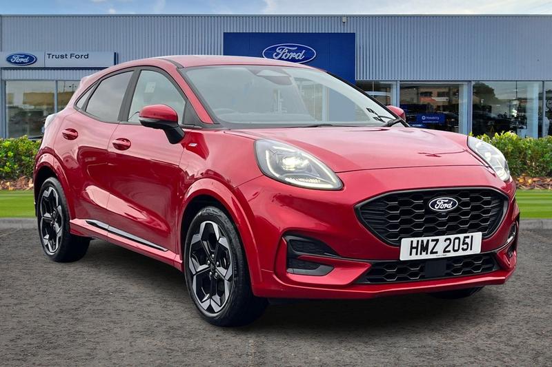 Driver impairment monitor, Emergency call service, Ford easy fuel, Full digital 12.8 instrument cluster, Lane keeping aid with lane departure warning, Power assist steering, Selectable drive modes(Normal, Eco, Sport, Slippery and Trail), Speed sign recognition, Automatic headlights with rain sensing wipers and auto high beam, Front fog lamps, LED daytime running lights, LED rear lamps, LED third brake light, Power foldable heated door mirrors with puddle lamps and puma logo protection, Quickclear heated windscreen, Rear privacy glass, Rear side wing doors, Rear wiper, STLine X body styling kit, 3 seat bench in 2nd row, 4 way lumbar support for passenger seat, Centre console with armrest and stowage, Electronic automatic temperature control (EATC), Ford megabox extended bootspace, Front and rear head restraints, Front floor mats, Manual 4 way driver seat adjust with lumbar adjustment, Single front passenger seat, STLine X Premium synthetic leather upholstery, 3 rear seatbelts, Child safety lock, Electronic stability control (ESC) and hill start assist, Precollision assist with autonomous emergency braking, pedestrian/cyclist detection & postcollision braking, Tyre pressure monitoring system (TPMS)