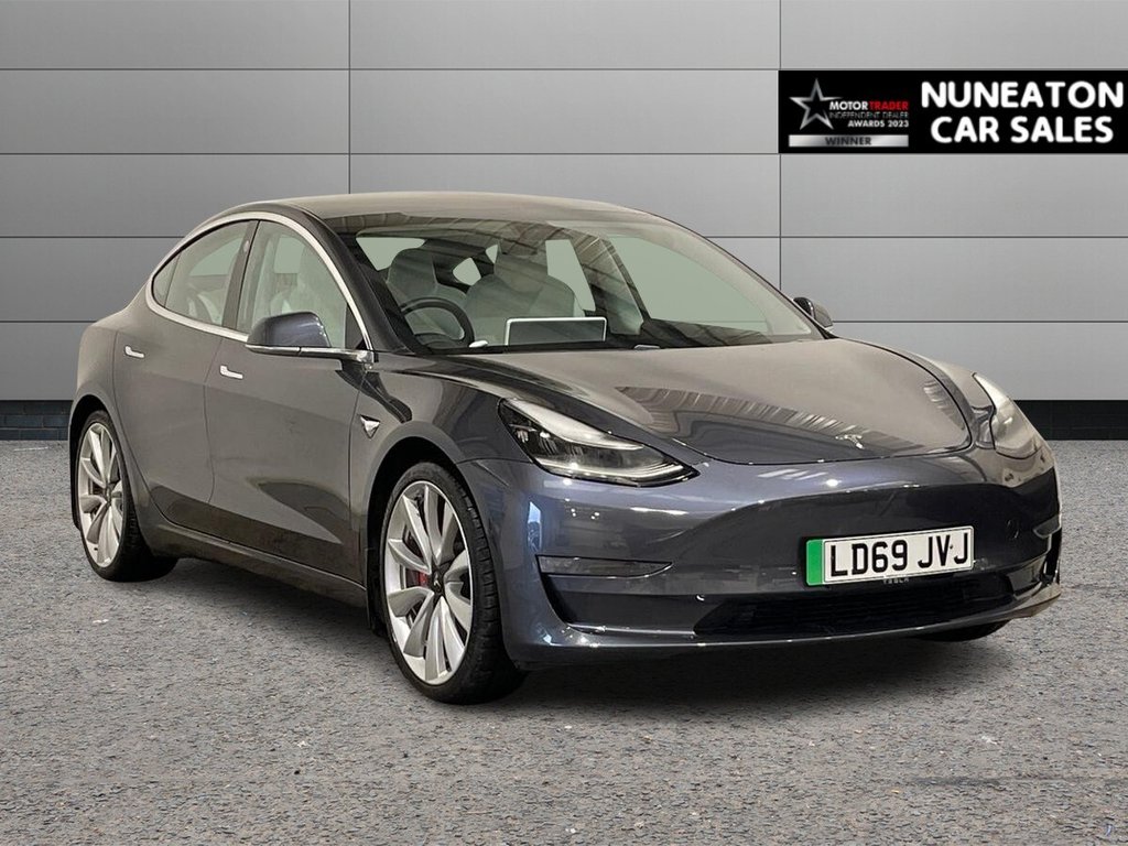 Nuneaton1 Previous Owner, Tesla Model 3 (Dual Motor) Performance Panoramic Roof, 360 Camera, White Leather Interior, Bluetooth Part Service History This 2019 Tesla Model 3 Performance boasts exceptionally low mileage for its age, having covered just 42176 miles, and comes with a clear vehicle history check. As an electric vehicle with four wheel drive, it offers an impressive battery capacity of 82 kWh, providing a maximum range of 329 miles when new. This Model 3 is equipped with heated front seats, a park assist camera system including front camera, air conditioning, rear parking sensors, and Bluetooth connectivity for your convenience. Experience exhilarating performance with this Model 3, capable of accelerating from 0 to 60mph in a remarkable 3.2 seconds, a figure that sets it apart from many other vehicles. Charging is efficient, with a full charge at home taking approximately 12 hours using a 7kW charger, and a rapid charge to 80% achievable in just 26 minutes at a public charging station. These attributes demonstrate the advanced capabilities and thoughtful design of this Tesla Model 3 Performance. Combining comfort, performance and practicality, this model is ideal for business use, longdistance driving or premium daily motoring. Service History Part service history recorded as follows: • Feb 2026 Nuneaton Car Sales Key Features & Specification • 20 Inch Alloy Wheels • Full LED Lighting • Front and Rear Parking sensors / 360 camera • Cruise Control • Air Conditioning / DualZone Climate Control • Satellite Navigation • DAB Digital Radio • Bluetooth Connectivity • USB / Voice Control • ISOFIX Child Seat Mounts • Driver Assistance Features • Panoramic Roof Vehicle Information • Registration: 28/09/2019 • Mileage: 42176 miles • Fuel Type: Electric • Transmission: Automatic • Owners: [2] • HPI Status: Clear Why Buy From Nuneaton Car Sales? * Multi AwardWinning Dealership * AA Approved Dealer * NO ADMIN FEES * 12 Months AA Breakdown Cover * MultiPoint Vehicle Inspection * Free MOT if due within 6 months * Competitive Finance Available * Part Exchange Welcome * Click & Collect & Home Delivery Available * Same Day Drive Away on most vehicles Extra Peace of Mind Personalised walkaround videos available on request. All vehicles professionally prepared and valeted prior to sale. This vehicle is pricechecked daily against the UK market to ensure excellent valu.12Way Power Adjustable Front and Rear Heated Seats, 15in Touchscreen with Onboard Maps and Navigation, 2 Zone Climate Control, 20in Alloy Wheels Performance, 3x3 Point Rear Seat Belts, 6040 Split Folding Rear Seats, ABS Antilock Braking System, Adaptive Cruise Control, Adaptive Steering, Air Conditioning, Airbags 6, Airbags Curtain, Airbags Driver, Airbags Passenger, Airbags Side, Aluminium Alloy Pedals, Ambient Interior Lighting, Audio Remote Control, Auto Dimming Power Folding Heated Side Mirrors, Automated HighBeam Assist, Automatic Emergency Braking, Autopilot Function, Blind Spot Information, Bluetooth Connection, Body Coloured Bumpers, Carbon Fibre Spoiler, Centre Console with Storage 4 USB Ports and Docking for 2 Smartphones, Collision Avoidance, Custom Driver Profiles, DVD, Daytime Running Lights LED, Digital Radio, Electric Hinged Side Doors Front, Electric Hinged Side Doors Rear, Electrically Adjustable Drivers Seat, Electrically Adjustable Passenger Seat, Electrically Adjustable Steering Column TiltTelescopic, Electronic Stability Control and Traction Control, Fixed Panoramic Glass Roof, Front Armrest, Front Cross Traffic Camera, Front Electric Windows, Front Fog Lights, Front Head Restraints, Front Parking Sensor, Front Trunk and Interior Floor Mats, Height Adjustable Drivers Seat, InCar Internet Streaming Music and Media, Interior Carpeting, Internet Browser, Internet Connection, Isofix Child Seat Anchor Points, Keyless Entry and Remote Control with App, Keyless Go, LED Foglights, LED Headlights, Lane Departure Warning, LocationAware Automatic Garage Door Opener, Map and Reading Lights, Media Storage, Mobile Phone App Interface, Navigation System, NonSafetyCritical Software Updates over Cellular, OEM Sound System, Park Assist Camera, Performance Brake Calipers, Power Steering Speed Sensitive, Premium Audio 14 Speakers 1 Subwoofer 2 Amps and Immersive Sound, Radio AMFM Internet Streaming, Rear Cross Traffic Camera, Rear Electric Windows, Rear Headrests, Rear Parking Sensor, Remote Central Locking, Reverse Parking Aid, SatelliteView Maps with Live Traffic Visualisation and Navigation, Seats Heated Front, Service Indicator, Software Updates over WIFI, SteerByWire Technology, Steering Wheel Mounted Controls, Telephone, Tinted Glass Roof with Ultraviolet and Infrared Protection, Track Mode, Traction Control, Traffic Sign Recognition, Trip Computer, Type 2 Public Charging Connector, Tyre