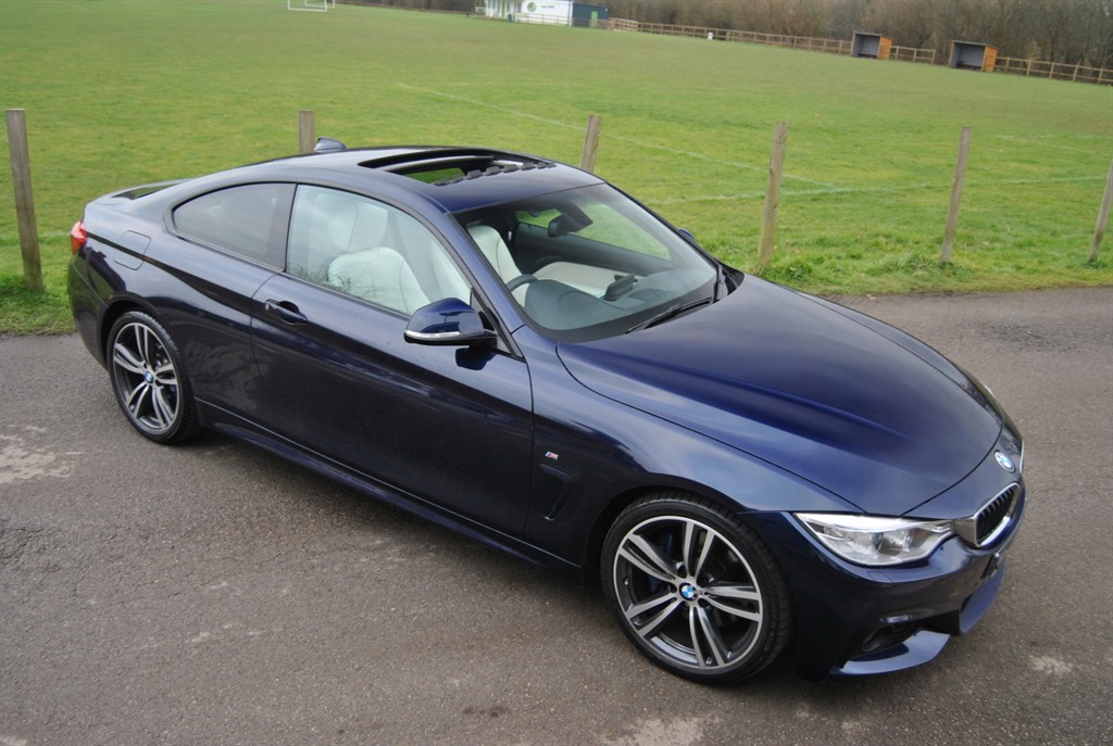 Stunning 420i M Sport Coupe Sports Automatic, BMW Special order Individual finished in Tanzanite Blue Metallic Paint with BMW Individual Opal White Leather Sport Seats. 54.000 miles with FSH 19 inch M double spoke bi colour alloy wheels M Sport brakes Locking wheel bolt Sport automatic gearbox Tyre pressure display Alarm system Exterior parts in vehicle colour M Sports package Electric Glass roof Sun protection glazing Floor mats velours Warning triangle and first aid kit Interior outside mirror with auto dip Interior mirror with automatic dip Sports seat Storage compartment package Seat heating driver passenger Armrest front retractable Aluminium brushed length with accent black hi gloss Blow by heater Headlight cleaning system Park Distance Control (PDC) Rain sensor Xenon Light Automatic air conditioning Cruise control with braking function Light package Additional 12V sockets Passenger airbag deactivation Navigation system Professional DAB tuner Harman Kardon surround sound system Intelligent emergency call Teleservices Connected Drive Services Real Time Traffic Information Concierge Services Remote Services Hands free system with USB interface Instrument panel with extended scope M Sports suspension M leather steering wheel M Aerodynamics package High gloss shadow line Headlining anthracite Coding alarm signal Automatic locking during starting Thief proofing device Outer skin protection Leather equipment A fantastic looking example James Paul Car Sales is a family run business in a small village of Bucks Green conveniently situated on the Surrey and Sussex border. Established for over 35 years every car we offer is carefully hand selected and will come with a comprehensive provenance check. All of our vehicles are subject to a thorough pre delivery inspection through our workshops including a fresh MOT and service where required. Please ask us about our extremely competitive finance packages or Visit our website www.jamespaul.co.uk to create your own Finance Quote and Apply to help you fund your new car. Part exchanges welcome either way if you are looking to trade up or down. Please note that we do not accept reservations on cars via third party sites, if you wish to put a deposit on a car, please call 01403 823723 and speak to a member of the James Paul Car Sales team.. 12V Power Socket in Front Centre Console and Passenger Footwell,18in Alloy Wheels M Double Spoke 400M,3.5mm Auxiliary Input Point in Centre Console for Auxiliary Playing Devices,6.5in Colour Display Screen,Air Breather Black High Gloss,Air Conditioning Automatic Dual Zone,Air Conditioning and Radio Control Panel in High Gloss Black,Airbags,Alarm System Thatcham 1 with Remote Control and Engine Immobiliser,Ambient Lighting Switchable BMW Classic Orange Cold White LED,Armrest Front Folding with Storage Compartment,Armrest Rear Centre with Two Cupholders,Automatically Dimming Rear View Mirror,BMW ConnectedDrive Online Services,BMW Emergency Call,BMW Professional Radio with Single CD Player with MP3 Playback Compatibility,BMW TeleServices,Battery Safety Cut Off,Bluetooth HandsFree Facility with USB Audio Interface and Audio Streaming,Bottle Holders Integrated into Door Trim Storage Compartments Front Up to 1 litre,Brake Pad Wear Indicator Front and Rear,Bumper System Front and Rear,Central Locking Switch Doors Fuel Filler Cap Luggage Compartment,Check Control Warning System for Monitoring of Lights and DoorLuggage Compartment Open Warning,Child Seat ISOFIX Attachment Rear with Passenger Airbag Deactivation,Concierge Service,Condition Based Service,Crash Sensor,Cruise Control with Brake Function,Cup Holders Two in Front with Sliding Lid,DAB Digital Radio,DSC Dynamic Stability Control Plus,Direction Indicator Side Repeaters Integrated in Exterior Mirrors,Direction Indicator Lights Clear Lenses,Door Mirrors Electric and Heated,Door Sill Finishers M Designation,Drive Performance Control ECO PRO Comfort Sport Sport Plus,Dynamic Brake Lights,Electric Windows Front with OpenClose Fingertip Control AntiTrap Facility and Comfort Closing Function,Exhaust Tailpipes Dual Left with Chrome Finisher,Extended Lighting,Exterior Parts in Body Colour,Exterior Trim HighGloss Shadowline,First Aid Kit and Warning Triangle,Floor Mats Velour,Fog Lights Front and Rear,Full Black Panel Display,Glove Compartment,Glove Compartment Opener with Chrome Trim,Handbrake Lever Gear Knob in Leather,Headlight Wash,Headlining Anthracite,Heat Protection Glazing with Green Tint,High Level Third Brake Light,Integrated Rear Seat Headrests Two,Interior Lighting Front Centre Over Interior Mirror with SoftLight and Rear Centre,Interior Trim Aluminium Hexagon Trim Finishers with Estoril Blue Matt Highlight,Kidney Grille Chrome with Extra Wide Black High Gloss Vertical Slats,LED Tailights,LightsOn Warning by Audio Warning Signal When Ignition is Switched Off,Luggage Compartment