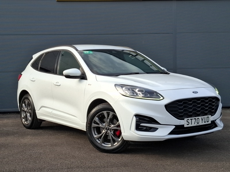 Mobile phone wireless charging pad, Front and rear parking sensors, B&O with large instrument cluster pack Kuga, ST Line body styling kit with unique front and rear fascia and bumper, rear painted diffuser, front painted skid plates, dark mesh upper grille, Hands free power tailgate, Lane keeping aid with lane departure warning, Rear parking sensor, ST Line front scuff plates, Quickclear heated windscreen, Day/night rear view mirror, Black roof rails, Front and rear head restraints, Ford MyKey Gen 2 safety system, Auto headlamps with high and low beam