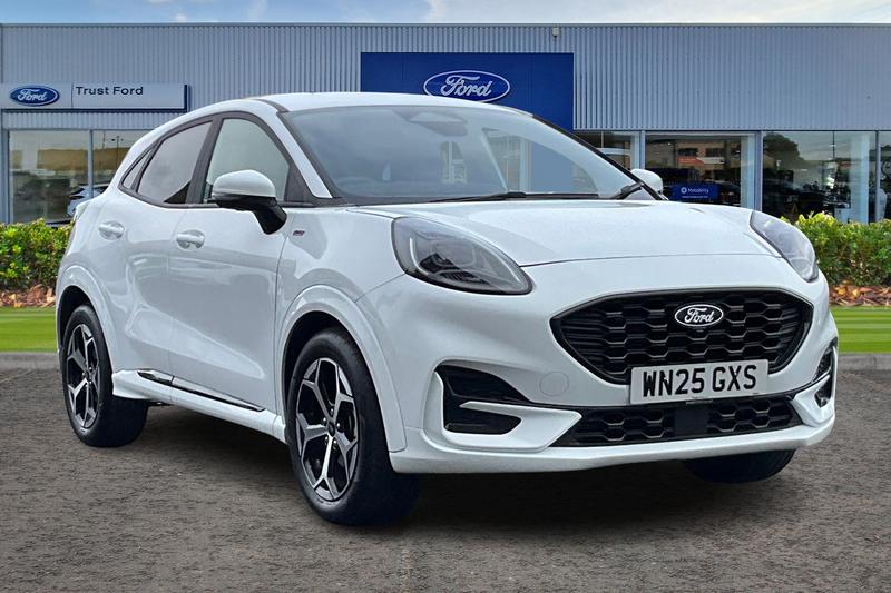 Insurance Group 13, Driver alert system, Emergency call service, Ford easy fuel, Full digital 12.8 instrument cluster, Lane keeping aid, Power assist steering, Selectable drive modes(Normal, Eco, Sport, Slippery and Trail), Speed sign recognition, Automatic headlights with rain sensing wipers and auto high beam, Front fog lamps, LED daytime running lights, LED rear lamps, LED third brake light, Power foldable heated door mirrors with puddle lamps and puma logo protection, Quickclear heated windscreen, Rear privacy glass, Rear side wing doors, Rear wiper, STLine body styling kit with unique grille, 3 seat bench in 2nd row, Centre console with armrest and stowage, Electronic automatic temperature control (EATC), Ford megabox extended bootspace, Front and rear head restraints, Front floor mats, Manual 4 way driver seat adjust with lumbar adjustment, Single front passenger seat, ST Line cloth trim with red stitching, 3 rear seatbelts, Child safety lock, Electronic stability control (ESC) and hill start assist, Precollision assist with autonomous emergency braking, pedestrian/cyclist detection & postcollision braking, Tyre pressure monitoring system (TPMS)