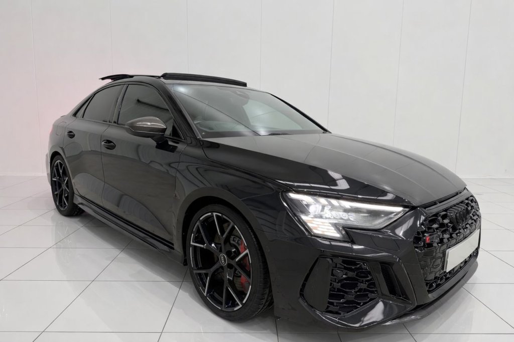 JUST INTO STOCK IS THIS STUNNING 2022 AUDI RS3 VORSPRUNG SALOON FINISHED IN MYTHOS BLACK, THIS VEHICLE IS FITTED WITH EVERY SINGLE OPTIONAL EXTRA FROM NEW SOME OF WHICH INCLUDE THE FOLLOWING, PANORAMIC SUNROOF BANG AND OLUFSEN SOUND SYSTEM HEADS UP DISPLAY MEMORY SEATS HEATED SEATS RS MODE CARBON EXTERIOR PACK CARBON INTERIOR PACK CARBON REAR SPOILER AND DIFFUSER STOCK VEHICLE NOT MODIFIED GHOST IMMOBILISER PLUS LOADS MORE .Audi Warranty 4 Years 75000 Miles Whichever Comes First, Dinamica MicrofibreArtifical Leather Black, Fine Nappa Leather Black, Mythos Black, Rear Side Airbags with Head Airbag System, 19in Alloy Wheels 5YSpokeBlack with Graphic Print, 4Way Lumbar Support for Front Seats, Adaptive Cruise Control, Adaptive Suspension with Audi Drive Select, Airbags Driver and Front Passenger with Passenger Airbag Deactivation, Aluminium Interior Elements, Ambient Lighting Pack, Anti Theft Locking Wheel Bolts, AntiTheft Alarm, Audi Beam, Audi Connect Emergency Call and Service, Audi Connect Infotainment Services (3 Month Subscription From New), Audi Drive Select, Audi Matrix LED Headlights with LED Rear Lights Dynamic Front and Rear Indicators Headlight Cleaning System, Audi PreSense Front, Audi Smartphone Interface, Audi Virtual Cockpit with RS Specific Display, AutoDimming RearView Mirror, Black Styling Pack, Bluetooth Interface, Brake Calipers Painted in Black with RS Logo at the Front, Camera Based Traffic Sign Recognition, Cloth Headlining in Black, Collision Avoidance Assistant, Comfort and Sound Package, DAB Digital Radio, Door Mirrors Electrically Adjustable Heated Folding Automatically Dimming with Memory Function and Integrated LED Indicators with Kerb View Function for Passenger Side, Door Sill Trims Inlays in Aluminium and Illuminated with RS3 Logo, Driver Assistance Package, DualZone Electronic Climate Control, ESC Electronic Stabilisation Control inc ABS ASR and EDL, Electric Windows Front, Electrically Adjustable Front Seats with Memory Function for Drivers Side, Electronically Operated Child Locks, First Aid Kit and Warning Triangle, Front Centre Armrest, Front Side Airbags with Head Airbags and Interaction Airbag, Front and Rear Floor Mats, HeadUp Display, Headlights Washers, Heated Front Seats, Hill Hold Assist, ISize and Top Tether Child Seat Mounting for the Outer Rear Seats, Interior Inlays Full Decorative Carbon Trim, Lane Departure Warning, Legal Emergency Call ECall, Light and Rain Sensor, MMI Navigation Plus with MMI Touch, Manual Boot Compartment Lid, Matt Aluminium Look Door Mirrors, Matt Aluminium Look Window Trims, Parking Assist with Parking System Plus, Pedals in Stainless Steel and Footrest in Black, Power Operated Tailgate, Privacy Glass, Progressive Steering, RS Body Styling, RS Emblem, RS Exterior Features in Gloss Black, RS Sport Exhaust System, Rear Suspension, Remote Central Locking, Revers