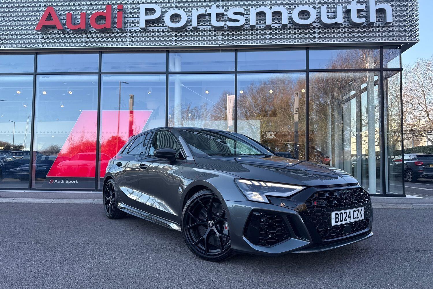 1 Previous Owner, Franchise Approved, COMFORT & SOUND PACK ( REAR VIEW CAMERA, BANG & OLUFSEN PREMIUM SOUND SYSTEM WITH 3D SOUND) RS DYNAMIC SUSPENSION, TOP SPEED INCREASED TO 180 MPH, RS CERAMIC BRAKES, RS DYNAMIC PACK, TECHNOLOGY PACK PRO ( RS SPORTS EXHAUST SYSTEM, RS EXTERIOR FEATURES IN GLOSS BLACK, CARBON ROOF SPOLIER, ENGINE COVER WITH CARBON ELEMENTS, BLACK APPEARANCE PACK PLUS, SIDE SKIRT IN CARBON ) ADVANCED KEY, COMFORT KEY WITH SAFELOCK, SATELLITE NAVIGATION, MULTI FUNCTION STEERING WHEEL, HILL HOLD ASSIST, CRUISE CONTROL, AUDI VIRTUAL COCKPIT, LANE DEPARTURE WARNING, APPLE CARPLAY, ANDROID AUTO, DAB RADIO, TINTED WINDOWS PRIVACY GLASS, FRONT AND REAR PARKING SENSORS, SPLIT FOLDING REAR SEATS, LIGHT & RAIN SENSOR, AUTO DIMMING REAR VIEW MIRROR, SELECTABLE DRIVING MODES, PUSH BUTTON START, DAYTONA GREY WITH LEATHER UPHOLSTERY, 19'' 5 SPOKE Y STYLE ALLOY WHEELS, DUAL ZONE CLIMATE CONTROL, HEATED FRONT SEATS, DARKENED MATRIX LED HEADLIGHTS WITH DYNAMIC REAR INDICATORS, VOICE ACTIVATED CONTROLS AND MUCH MORE.This car comes with the balance of the manufacturers warranty until 18/4/2027.Portsmouth Audi are delighted to offer this Audi RS3 in Daytona grey over Leather and has completed just 13005 miles., We are proud to be part of the Harwoods group, a family run business established in 1931. With four Approved Audi retailers within our group, we have access to over 400 vehicles. If this isn't the right car for you, please contact us and we will find it. Our group stock has spec to include Sunroof, Leather, Heated Seats, Apple Car Play, Heated Steering Wheel, Reverse Camera, Rear Entertainment, Towbar, 360degree camera, Comfort & Sound Pack, Tech Pack, Panoramic Sun Roof, Tow Bar, Black Pack, Air Suspension, Apple Carplay, Adaptive Cruise, Massage Seats, Refrigerator, AWD, Technology Pack, Head up Display.