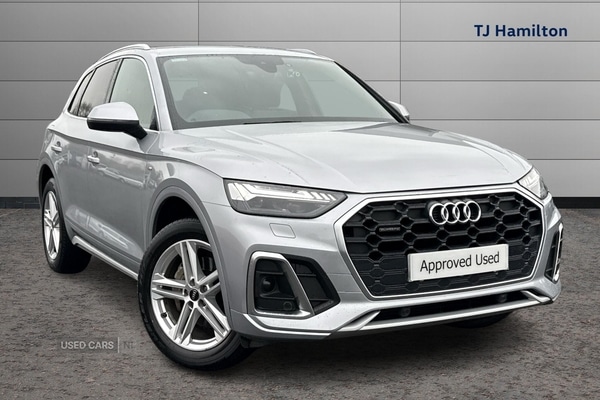 Cookstown1 Previous Owner, This 2021 Audi Q5 TDI S line offers a superb blend of performance and practicality. As a Euro 6 compliant model, it features a robust 2.0 litre diesel engine paired with Audi's renowned four wheel drive system, ensuring confident handling in all conditions. The S line trim enhances its already sophisticated appeal, while practical features such as front and rear parking sensors, a reversing camera, and the Audi Wireless Smartphone Interface with Android Auto and Apple CarPlay make every journey more convenient. Matrix LED headlights with dynamic indicators provide excellent visibility and a distinctive look. With a towing weight of 2400 kg, this Q5 is well equipped for a variety of needs. Its impressive acceleration from 0 to 62 mph in just 7.6 seconds demonstrates its responsive power, while the highlighted fuel economy of 44 mpg indicates efficient performance for its class. The generous boot space further adds to its versatility, making it an excellent choice for families or those requiring ample storage. These highlights collectively position this Audi Q5 as a superior option compared to similar vehicles.