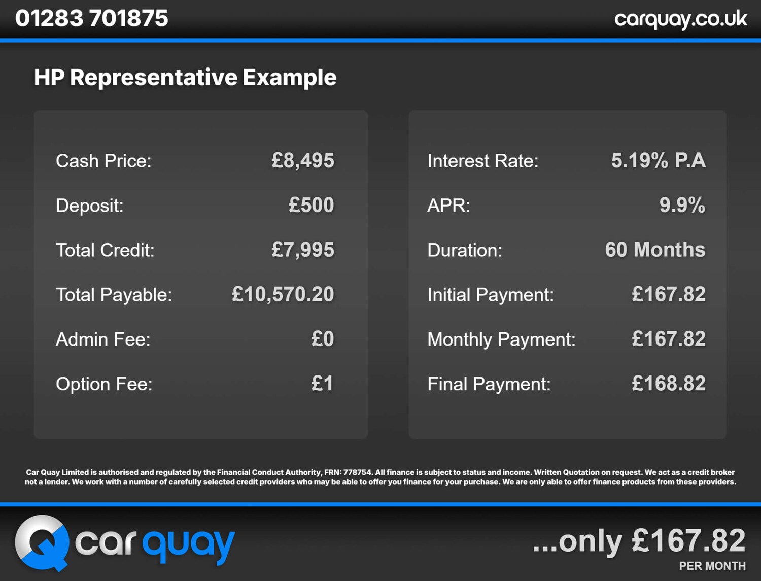 If your borrow amount is £6,000 with a deposit of £1,000, a selected term of 48 months, at a representative APR of 17.8%, you would pay £171.56 per month. Total charge for credit will be £2,234.88 and total amount payable is £9,234.88. CarMoney Limited can introduce you to a limited number of finance providers based on your credit rating and CarMoney will receive a commission for such introductions that can either be a % of the amount borrowed or a flat fee. This does not influence the interest rate you’re offered in any way. CarMoney is a broker not a lender.