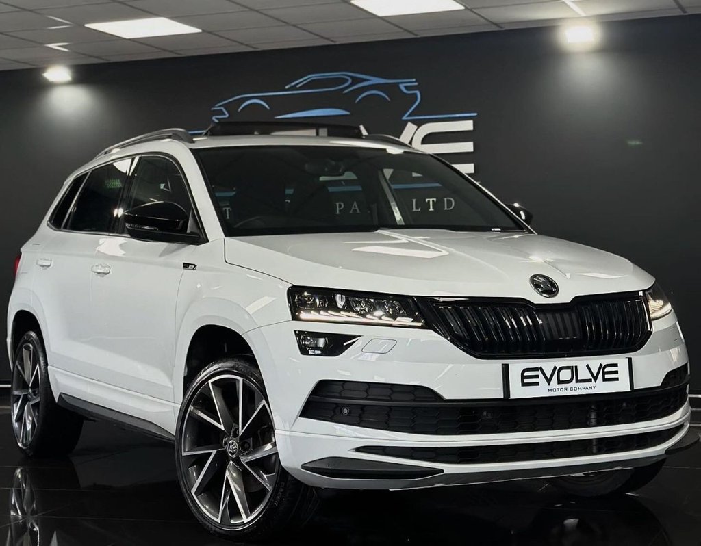 NewportInsurance Group 16, 1 Previous Owner, Excellent Example Skoda Karoq ACR SportLine DSG Finished In Mood White with 61,500 Miles Specification to Include: Panoramic Sliding Sunroof, Moon White metallic Piano Black/Carbon decor SPORTLINE Fabric Reverse Camera, Front & Rear Parking Sensors, Automatic LED Headlights, 19" Diamond cut Alloys, .SPORTLINE Fabric Black, Moon White, 12V Power Socket in Boot, 19in Alloy Wheels Vega Anthracite, 2 Reading Lights Front For Driver and Passenger, 3 Spoke Leather Sports MultiFunction Steering Wheel, 4 Foldable Roof Handles with Clothes Hooks in Rear, Aero Front Windscreen Wipers with Intermitted Function, Air Conditioning Climate Control Dual Zone, Air Vent Surrounds in Black, Airbags Driver, Airbags Front Passenger with Deactivation, Alarm with Interior Monitoring Back Up Horn Tilt Sensor and SAFE Function, Aluminium Pedals, Amundsen Satellite Navigation with 8in Touchscreen Display Integrated Wifi and Infotainment Online 1 Year and WLAN, AntiTheft Locking Wheel Bolts, Automatic Door Unlocking Incase of Crash, Automatic Fuel Cut Off Incase of Crash, Black Roof Headlining, Black Roof Rails Door Mirrors and Radiator Grille, Bolero Radio, Boot Package 2 Folding Hooks and Nets, Bottle Holders in Door Panel in the Front 1.5 Litre Bottle Driver and Passenger Door Panels, Cargo Element in Luggage Compartment, Chrome Interior Door Handles, Chrome Package Outside Aluminium Bar Around the Windows, Colour Multifunction Trip Computer, Cruise Control with Speed Limiter, DAB Digital Radio and Bluetooth, Drive Mode Selection, Driver Fatigue Sensor, ESC Electronic Stability Control incl ABS Anti Lock Braking System, Electric Front and Rear Windows with Child Proof Lock, Electric Window Control Buttons in Black, Electrically Adjustable Heated Folding Door Mirrors Auto Dimming Boarding Spots, Electrically Operated Boot Door, Electronic Engine Immobiliser, Electronic Parking Brake with Auto Hold Function, Emergency Brake Signal, Foldable Hooks in the Boot, Front Head Knee Curtain Front Side Airbags, Front Assist Radar, Front Centre Armrest with Storage Compartment Rear Air Vents and 12v Socket, Front Door Step with Sportline Logo, Full LED Headlights with AFS and LED Daytime Running Lights, Glovebox Illuminated and Cooled, Headlights Automatic Activation, Headlights Washers, Heated Front Seats, Heated Rear Windscreen, Height Adjustable Driver and Front Passenger Seat, Height Adjustable Front ThreePoint Seat Belts with Tensioners, ISOFIX Child Seat Preparation Outer Rear, Ice Scraper, Illumination of Luggage Compartment, KESSY Keyless Entry and Start System with SAFE System, LED Interior Light Package and SKODA Welcome Light, Light Assistant, Light and Rain Sensor with AutoDimming Rear View Mirror, Luggage Compartment
