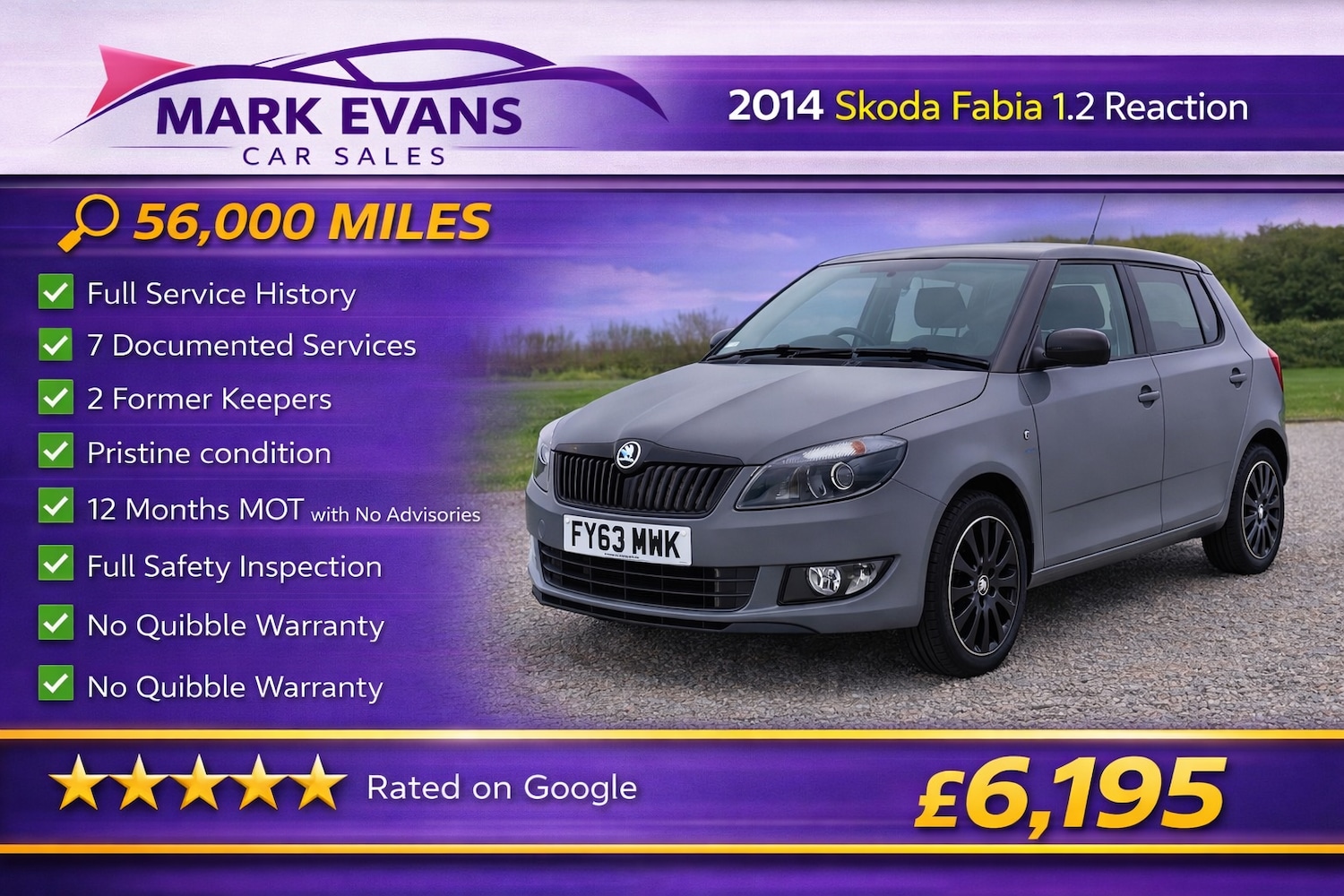 St AgnesInsurance Group 5, Only 56,000 MILES FULL SERVICE HISTORY 7 DOCUMENTED SERVICES PRISTINE CONDITION..... This Skoda Fabia 1.2 Reaction has covered just 56,000 MILES from new and comes with a FULL SERVICE HISTORY including 7 DOCUMENTED SERVICES. It has had 2 FORMER KEEPERS and is presented in pristine condition throughout, clearly reflecting careful ownership and consistent maintenance. Well maintained Fabias with this level of history are becoming increasingly difficult to find...... The vehicle will be supplied with a brand new 12 month MOT with no advisories, a no quibble warranty, a full professional valet and a complete safety inspection, providing total peace of mind..... Powered by the reliable and economical 1.2 petrol engine, the Fabia offers smooth performance, low running costs and excellent practicality. Known for its solid build quality and dependable engineering. Despite its compact size, it provides a surprisingly spacious interior and a generous boot, making it both practical and easy to live with.... At just £6195, this beautifully maintained Skoda Fabia represents outstanding value and a superb opportunity to purchase a well cared for example in excellent condition...... We specialise in sourcing the very best low mileage high quality vehicles. Mark Evans Car Sales is based in St Agnes Cornwall TR5 0PA. We pride ourselves on our honesty integrity and five star service. Please take a moment to read our five star Google reviews, we are very proud of them. The Evans family has been in the motor trade in Cornwall for over 50 years and we continue to work hard to uphold our reputation for quality and trust.