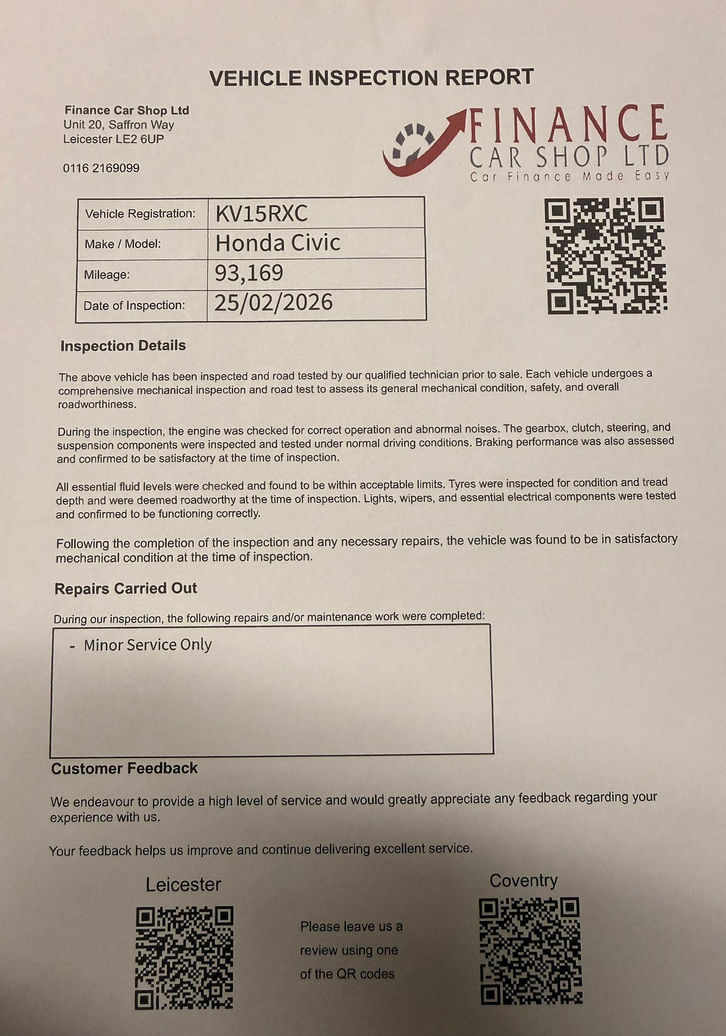 LeicesterInsurance Group 5, 2 Previous Owners, FOR SALE: Honda Civic 1.4 iVTEC SE Plus Euro 6 (s/s) 5dr A stylish, reliable, and featurepacked family hatchback perfect for commuting, city driving, or long journeys! Key Details:2 Former KeepersRecent Service Completed1.4 iVTEC Petrol EngineEuro 6 Compliant (Start/Stop)5 Doors Practical & Spacious Features Include:Reverse Camera for Easy ParkingBluetooth ConnectivityCruise Control & Speed LimiterAir ConditioningElectric Windows & MirrorsRemote Central LockingISOFIX Child Seat PointsThis Civic combines excellent fuel economy, a smooth drive, and low running costs. Well maintained and freshly serviced, its ready to drive away today.+ 6 MONTHS WARRANTY INCLUDED + 6 MONTHS BREAKDOWN COVER + EXTENDED WARRANTY AVAILABLE + FINANCE OPTIONS AVAILABLE UPON REQUEST + DELIVERY CAN ONLY BE ARRANGED ONCE THE VEHICLE HAS BEEN VIEWED & INSPECTED IN PERSON AT OUR PREMISES + PHOTO ID IS REQUIRED FOR ALL VIEWINGS AND TEST DRIVES + WE CAN BE REACHED VIA WHATSAPP ON 07458 300017 FEEL FREE TO MESSAGE US + PLEASE NOTE, THE PRICE IS FIXED ON THIS VEHICLE. KINDLY BE AWARE OF THIS PRIOR TO ARRANGING A VIEWING + WE HAVE OVER 50 VEHICLES IN STOCK. AS NOT ALL VEHICLES ARE HELD ON SITE, PLEASE ENSURE YOU CALL IN ADVANCE BEFORE MAKING YOUR JOURNEY + BANK TRANSFER ONLY + MORE CARS AVAILABLE AT:WWW.FINANCECARSHOPLTD.CO.UK +
