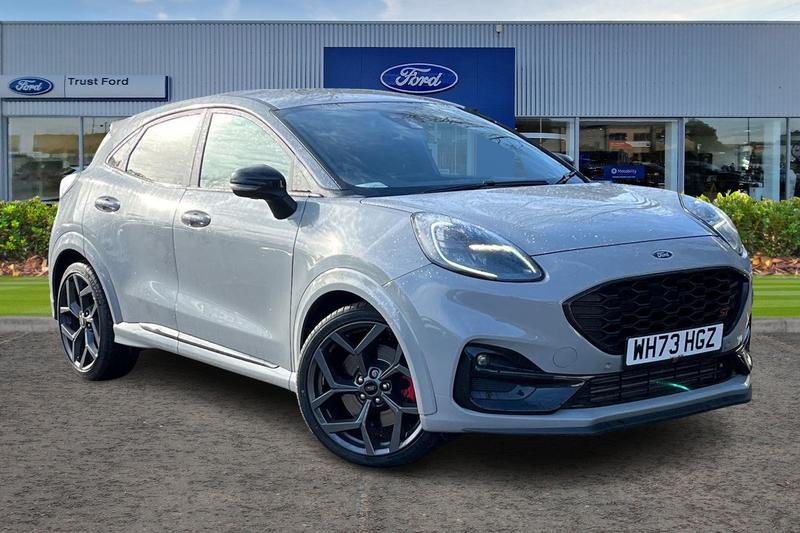 Insurance Group 22, Cruise control with Intelligent speed assist, Driver impairment monitor, Emergency call service, Ford easy fuel, Front and rear parking sensors, Full digital 12.3 instrument cluster, Lane keeping aid with lane departure warning, Power assist steering, Selectable drive modes (normal, sport, eco, track), Speed sign recognition, Automatic headlights with auto high beam, Automatic rain sensing wipers, Dual chrome exhaust, Fixed LED signature headlamps, Front fog lamps, LED daytime running lights, LED rear lamps, Power foldable heated door mirrors with puddle lamps and puma logo protection, Privacy glass to side rear windows and tailgate glass, Quickclear heated windscreen, Rear side wing doors, Rear wiper, ST scuff plates, Third brake light, Unique ST body styling kit including wing mirrors and Ford Performance embossed splitter, 3 seat bench in 2nd row, Alloy sports pedals, Centre console with armrest and stowage, Ford megabox extended bootspace, Ford Performance sensico partial premium leather upholstery with metal grey stitching, Front and rear floor mats, Front and rear head restraints, Manual 6 way driver seat adjust with lumbar adjustment, Manual 6 way passenger seat with lumbar seat adjustment, Single front passenger seat, ST flat bottomed steering wheel with metal grey stitching, ST logo projection, Unique ST gear shift knob, Wireless charging pad with electronic air temperature control (EATC), 3 rear seatbelts, Child safety lock, Electronic stability control (ESC) and
