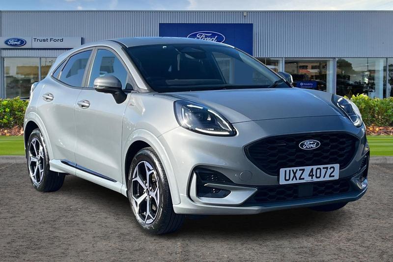 Insurance Group 12, Driver alert system, Emergency call service, Ford easy fuel, Full digital 12.8 instrument cluster, Lane keeping aid, Power assist steering, Selectable drive modes(Normal, Eco, Sport, Slippery and Trail), Speed sign recognition, Automatic headlights with rain sensing wipers and auto high beam, Front fog lamps, LED daytime running lights, LED rear lamps, LED third brake light, Power foldable heated door mirrors with puddle lamps and puma logo protection, Quickclear heated windscreen, Rear privacy glass, Rear side wing doors, Rear wiper, STLine body styling kit with unique grille, 3 seat bench in 2nd row, Centre console with armrest and stowage, Electronic automatic temperature control (EATC), Ford megabox extended bootspace, Front and rear head restraints, Front floor mats, Manual 4 way driver seat adjust with lumbar adjustment, Single front passenger seat, ST Line cloth trim with red stitching, 3 rear seatbelts, Child safety lock, Electronic stability control (ESC) and hill start assist, Precollision assist with autonomous emergency braking, pedestrian/cyclist detection & postcollision braking, Tyre pressure monitoring system (TPMS)