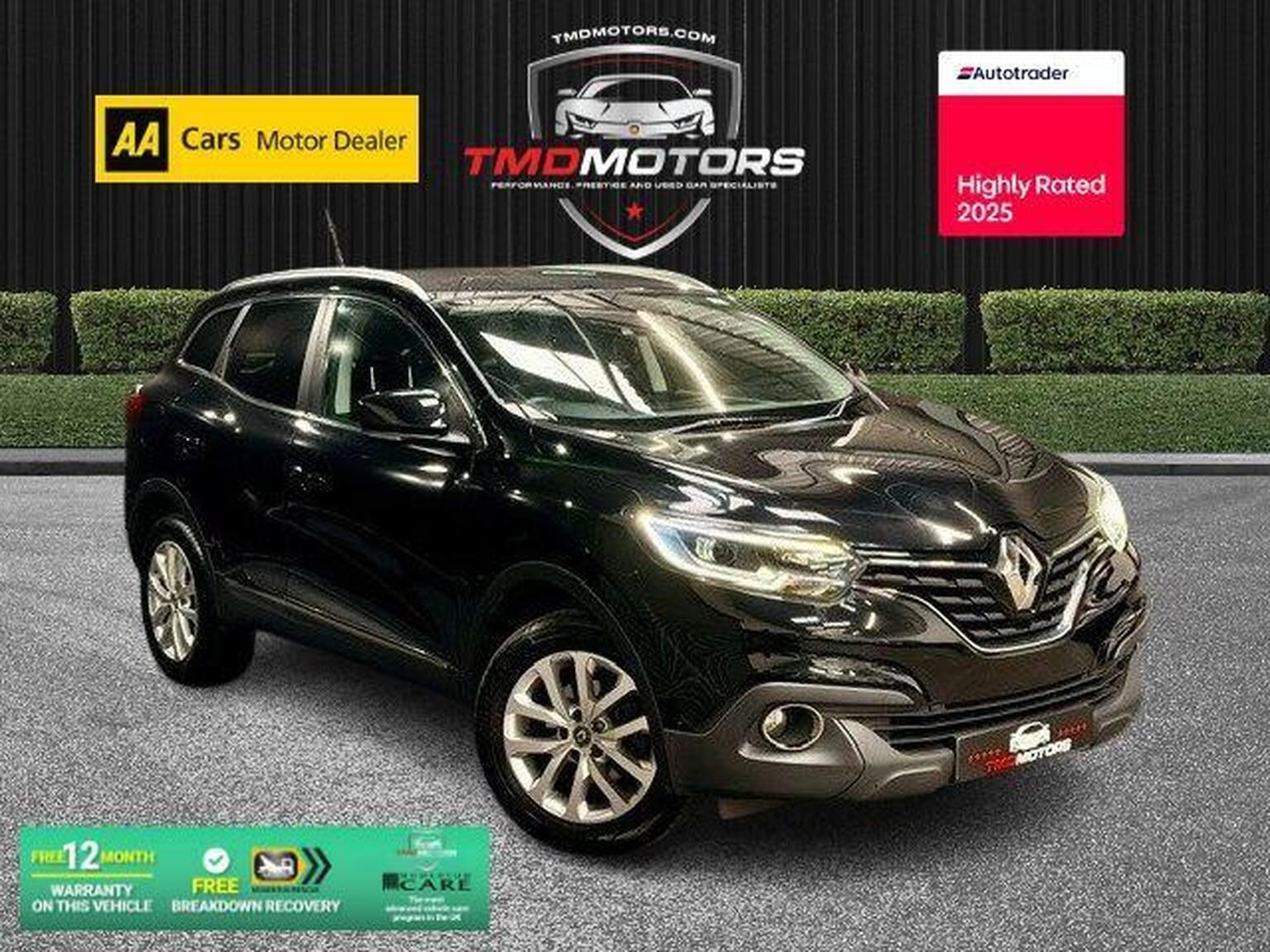 Newcastle Upon TyneThis smart and wellequipped Renault Kadjar Dynamique in sleek black offers SUVstyle practicality with hatchback comfort and efficiency. With just 36,000 miles, this lowmileage example has been well maintained and drives superbly, making it an excellent choice for families, commuters, or anyone wanting a stylish crossover. Powered by the responsive 1.2 TCe turbo petrol engine, the Kadjar delivers smooth performance with great fuel economy, whether driving around town or cruising on the motorway. Key Details: Engine: 1.2 TCe Turbo Petrol smooth, efficient & reliable Transmission: Manual easy and refined to drive Mileage: 36,000 miles low mileage, very well cared for Colour: Gloss Black modern, stylish finish Body Style: 5Door Hatchback Crossover practical and versatile Euro 6 Compliant fully ULEZ friendly Added Benefits: 12 Months Warranty included via Momentum Warranties, the UK's most advanced vehicle protection program 12 Months FREE AA Breakdown Cover complete peace of mind Machine Polished & Professionally Valeted presented to showroom condition MOT Ready fully inspected and roadtested Dynamique Specification Includes: Navigation System with HDD builtin sat nav for stressfree journeys Parking Sensors effortless parking and manoeuvring Air Conditioning comfortable cabin all year round Alloy Wheels stylish design with strong road presence Tyre Inflation Kit added reassurance on the road Why Choose This Renault Kadjar Dynamique? Low Mileage Only 36,000 Miles Economical Turbo Petrol Engine High Driving Position with SUV Practicality Great Specification Including Navigation & Parking Sensors Ideal for families, commuting, or longdistance driving This Renault Kadjar Dynamique offers comfort, efficiency, and modern styling in a wellpresented, lowmileage package. Available now at TMD Motors book your test drive today! Call now this lowmileage Kadjar won't be around for long!