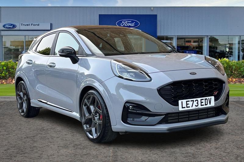 Insurance Group 22, Cruise control with Intelligent speed assist, Driver impairment monitor, Emergency call service, Ford easy fuel, Front and rear parking sensors, Full digital 12.3 instrument cluster, Lane keeping aid with lane departure warning, Power assist steering, Selectable drive modes (normal, sport, eco, track), Speed sign recognition, Automatic headlights with auto high beam, Automatic rain sensing wipers, Dual chrome exhaust, Fixed LED signature headlamps, Front fog lamps, LED daytime running lights, LED rear lamps, Power foldable heated door mirrors with puddle lamps and puma logo protection, Privacy glass to side rear windows and tailgate glass, Quickclear heated windscreen, Rear side wing doors, Rear wiper, ST scuff plates, Third brake light, Unique ST body styling kit including wing mirrors and Ford Performance embossed splitter, 3 seat bench in 2nd row, Alloy sports pedals, Centre console with armrest and stowage, Ford megabox extended bootspace, Ford Performance sensico partial premium leather upholstery with metal grey stitching, Front and rear floor mats, Front and rear head restraints, Manual 6 way driver seat adjust with lumbar adjustment, Manual 6 way passenger seat with lumbar seat adjustment, Single front passenger seat, ST flat bottomed steering wheel with metal grey stitching, ST logo projection, Unique ST gear shift knob, Wireless charging pad with electronic air temperature control (EATC), 3 rear seatbelts, Child safety lock, Electronic stability control (ESC) and