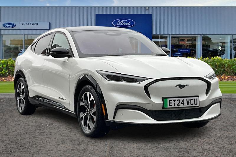 Insurance Group 42, 10.2 digital insturment cluster, 360 degree view camera, Active park assist, Applink remote control system, BLIS (Blind Spot Information System) with cross traffic alert, Distance alert and indication system, Electric power steering, Emergency services call system, Ford SYNC4A with 15.5Touch, DAB radio, Emer assist, Wireless carplay androidauto, 2 front, rear USB ports, FordPass connect, Connected naviation, Front and rear parking sensors, Hands free tailgate, Intelligent adaptive cruise control with stop and go + lane centering, Lane departure warning with lane keeping aid, Selectable drive modes active, whisper and untamed, Trip computer, Wireless charging pad, Adaptive LED Mustang signature headllamps, Black painted power fold heated mirrors with puddle light mustang logo projection, Blade front grille design, Body colour bumpers, Daytime running lights, Fixed full panoramic roof, LED 3rd brake light, LED Mustang signature tail lights, Quickclear heated windscreen, Rear privacy glass, Rear side wing doors, Rear wiper, Side cladding and wheel arches in piano black, 3 seat bench in 2nd row, 8 way power driver seats with lumbar support, 8 way power passenger seats with lumbar support, Ambient lighting, Dual electronic automatic temperature control, Front headrests, Front trunk, Heated front seats and steering wheel, One pedal drive, Perforated full sensico artificial leather upholstery, Rear head restraints, Single front passenger seat, 3 point rear seatbelts, ABS, Child