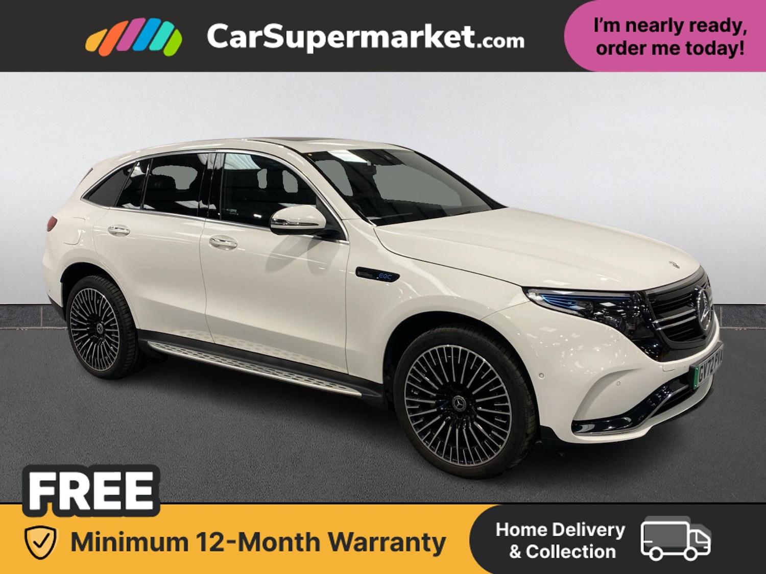 Insurance Group 50, 0 Previous Owners, The MercedesBenz EQC 400 300kW AMG Line Premium 80kWh Auto in white is a fullelectric luxury SUV with lane departure warning, blind spot monitoring, cruise control, satellite navigation, digital radio, an electric sliding sunroof, privacy glass, and heated front seats.