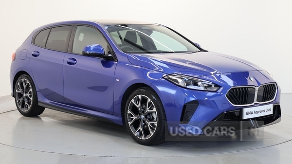 Coleraine0 Previous Owners, This 2025 BMW 1 Series 120i M Sport is a BMW manufacturer approved vehicle, offering excellent provenance. This Euro 6 compliant model features a 1.5 litre petrol hybrid engine and is presented in the sporty M Sport trim. It comes equipped with the desirable Technology Pack, which includes automatic LED headlights, keyless entry, and wireless phone charging, alongside the Parking Assistant package with front and rear sensors and a rear camera for effortless manoeuvring. Further enhancing comfort and privacy, this 1 Series also benefits from sun protection glass.The performance of this BMW 1 Series is a key highlight, achieving 0 to 62 miles per hour in just 7.8 seconds, demonstrating its responsive acceleration. These features and its impressive performance indicate how this vehicle stands out from others in its class, offering a refined and dynamic driving experience. Mild Hybrid Technology, EU6 RDE II exhaust emissions standard, 18'' M Lt/Aly wheels Yspoke style 975 M, Auto transmission with gearshift paddles, Tyre Repair Kit, M Adaptive Suspension, Alarm System, M Illuminated Aluminium hexacube interio, Child seat iSize attachment for front p, Sport seats, Heated front seats, Driving Assistant, Active Guard, Parking Assistant, BMW TeleServices, BMW Emergency Call, Personal eSIM, DAB Radio, Highgloss Shadowline Exterior Trim, Anthracite Headlining, COC additional contents, Active Pedestrian Safety, English / onboard literature II, M Sport exterior parts, M Sport interior parts, M Sport Package, Roof in Black, Comfort Access, Sun Protection Glass, Ext. mirrors folding with antidazzle, Rearview Mirror with Auto dimming, HighBeam Assistant, Adaptive LED Headlights, Storage for wireless charging, Technology Pack. Blue 5 seats. BMW Approved Used Car