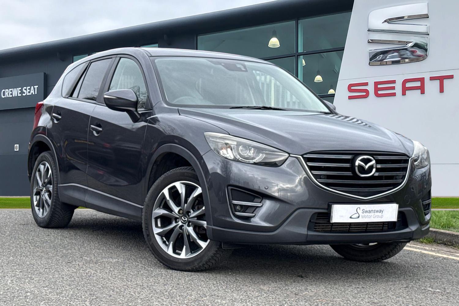 Insurance Group 21, 1 Previous Owner, The Mazda CX5 2.2 SKYACTIVD Sport Nav Auto 4WD Euro 6 (s/s) 5dr in Grey is a refined and capable SUV that perfectly balances performance, efficiency and premium comfort. Powered by Mazdas responsive 2.2 litre SKYACTIVD diesel engine and paired with a smooth automatic transmission and intelligent four wheel drive system, it delivers confident handling and assured grip in all conditions while remaining impressively economical and Euro 6 compliant. Finished in an elegant grey with striking 19 inch gunmetal alloy wheels, this CX5 features subtle chrome accents across the dash, door trims and steering wheel switch panels, complemented by silver detailing on the audio controls for a sophisticated interior feel. The exterior styling is enhanced by double exhaust tailpipes, LED headlights with Adaptive Front Lighting System, LED rear lights, privacy glass to the rear, and door mirrors with integrated LED indicators. Inside, the cabin is both spacious and thoughtfully designed, offering an 8 way electrically adjustable drivers seat, heated front seats and smart keyless entry with engine start stop button for everyday convenience. The electronic parking brake, cruise control and front and rear parking sensors, along with a reversing camera, make driving effortless whether on long motorway journeys or in tight urban spaces. Technology is at the heart of this Sport Nav model, featuring a 7 inch colour TFT touchscreen with Mazdas Multimedia Commander, an integrated Bluetooth sys...
