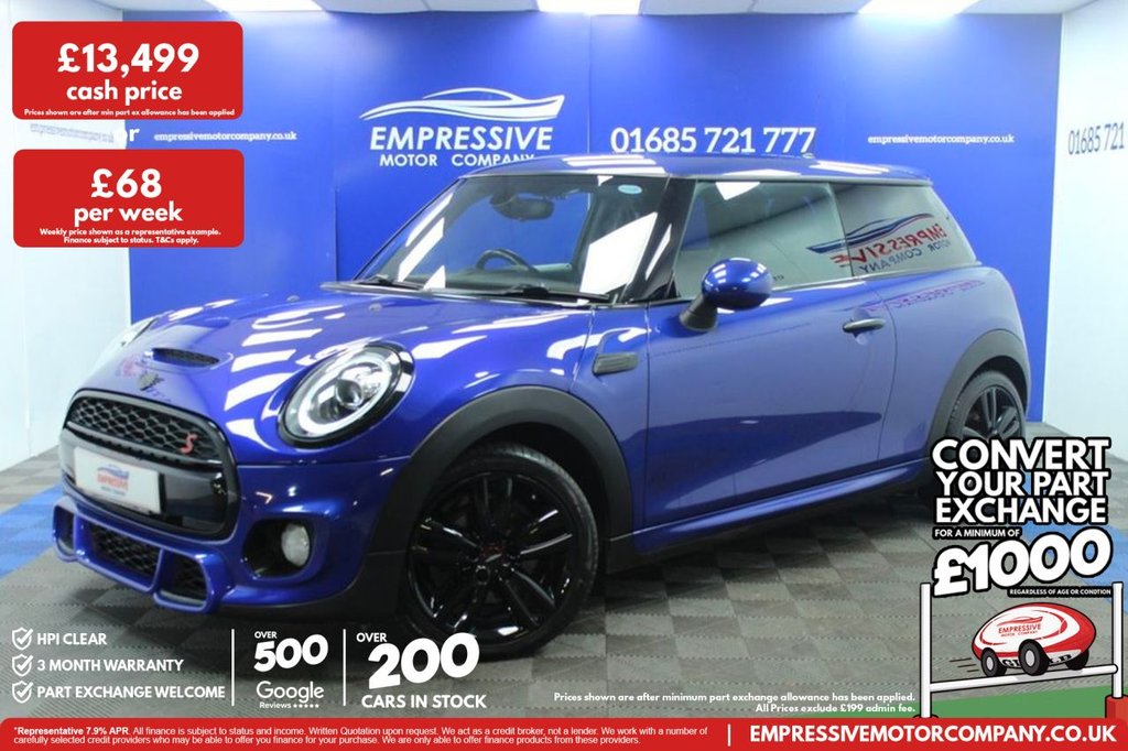 Merthyr TydfilInsurance Group 28, ****HOT HATCH**** Just in! This Stunning 2019 MINI HATCH 2.0 Cooper S Sport Hatchback 3dr Petrol Manual Euro 6 (s/s) (192 ps) Finished In Blue! 56,342 Miles 2.0L Petrol 6 Speed Manual 17" Gloss Black Wheels John Cooper Works Union Jack Rear Lights Ambient Lighting Keyless Start Stop Start Climate Control System Traction Control System Bluetooth Speed Limiter Cruise Control Automatic LED Headlights Automatic Window Wipers Voice Assistant .12V Socket in Centre Console, 17in Alloy Wheels John Cooper Works Track Spoke Black, 3 Point Seatbelts on all Seats, 4 Lashing Eyes in Luggage Compartment, 4 Speakers in Front Door Trims and Underneath Front Seats, 6.5in Screen with LED Ring, Air Conditioning Manual, Airbags, Alarm System, AntiLock Braking System ABS, Automatic Headlight Activation Switch, Bluetooth for Compatible Mobile Phone with Audio Streaming, Bonnet Scoop, Carbon Black Colour Line Knee Roll and Door Armrests, Chrome Highlights, Cruise Control with Brake Function, Cup Holders, Door Storage Compartments, Dynamic Brake Lights, Dynamic Stability Control DSC, Electric Windows Front, ElectroMechanical Steering with Speed Dependant Steering Assistance, Electronic Vehicle Immobiliser, Exhaust Tailpipe Double Central with Chrome Finishers, FM Tuner and DAB Digital Radio, Foldable Rear Seats 6040, Front and Rear ISOFIX including Front Passenger Airbag Deactivation, Fuel Filler Cap in Chrome, GearChange Indicator Display, Glove Compartment, Headliner Anthracite, Heated Rear Window, Heated Windscreen Washer Jets, Instrument Cluster, Interior Lighting, Interior Surface Black Chequered, John Cooper Works Aerodynamic Kit, John Cooper Works Leather Steering Wheel, John Cooper Works Roof Spoiler, John Cooper Works Sport Seats, Leatherette Gearshift Lever and Handbrake Gaiters, LED Headlights with Closed Ring as Daytime Driving Lights, LED Reading Lights Vanity Mirror Lights Front Footwell Lights Spotlights on Front Seats, Mechanical Seat Adjustment, MINI ECall, MINI Logo Projection on Floor from Drivers Exterior Mirror, MINI TeleServices, Model Logo Cooper S on Right of Tailgate, Multifunction Controls for Steering Wheel, OnBoard Computer, Performance Control, Radiator Grille Chrome Border with Honeycomb Structure including S Badge, Rain Sensor Window Wipers, Rear Fog Light, Rear LED Lights with Union Jack Design, Rear Window Wiper, Roof and Mirror Caps BodyColour, Side Scuttle Panels with Integrated Indicators, StartStop Toggle including Keyless Go, Steering Column Height and Length Adjustment, Storage Pockets on Back of Front Seats, Sun Visor with Vanity Mirrors, SunHeat Protection Glass, Tool Kit in Luggage Compartment, TwoTone Horn, Tyre Pressure Monitoring System, White Indicator Lenses