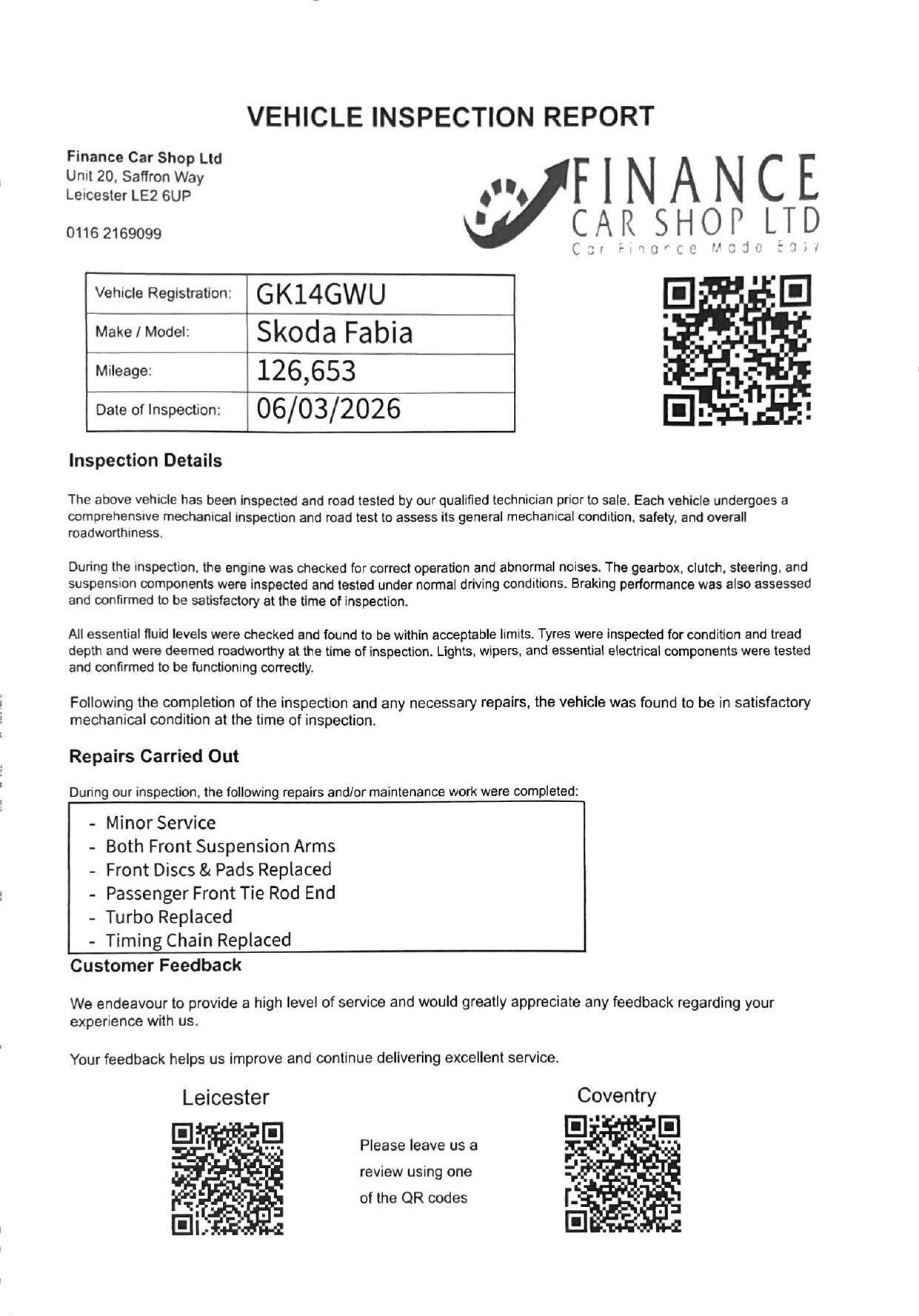LeicesterInsurance Group 13, 1 Previous Owner, Skoda Fabia 1.2 TSI Elegance Euro 5 5 DoorWell maintained Skoda Fabia 1.2 TSI Elegance in excellent condition. A practical, stylish, and economical hatchback, perfect for commuting, families, or firsttime drivers.Key Details1.2 TSI Petrol EngineManual GearboxEuro 55 Doors1 Former KeeperFull Service HistoryRecently ServicedFeaturesAlloy WheelsAir ConditioningUSB / AUX InputElectric WindowsElectric MirrorsRemote Central LockingMultifunction Steering WheelConditionDrives smoothly with a reliable engine and gearbox. Clean inside and out, very well maintained, and ready to drive away. Practical and comfortable with a spacious interior for its size. + 6 MONTHS WARRANTY INCLUDED + 6 MONTHS BREAKDOWN COVER + EXTENDED WARRANTY AVAILABLE + FINANCE OPTIONS AVAILABLE UPON REQUEST + DELIVERY CAN ONLY BE ARRANGED ONCE THE VEHICLE HAS BEEN VIEWED & INSPECTED IN PERSON AT OUR PREMISES + PHOTO ID IS REQUIRED FOR ALL VIEWINGS AND TEST DRIVES + WE CAN BE REACHED VIA WHATSAPP ON 07458 300017 FEEL FREE TO MESSAGE US + PLEASE NOTE, THE PRICE IS FIXED ON THIS VEHICLE. KINDLY BE AWARE OF THIS PRIOR TO ARRANGING A VIEWING + WE HAVE OVER 50 VEHICLES IN STOCK. AS NOT ALL VEHICLES ARE HELD ON SITE, PLEASE ENSURE YOU CALL IN ADVANCE BEFORE MAKING YOUR JOURNEY + BANK TRANSFER ONLY + MORE CARS AVAILABLE AT:WWW.FINANCECARSHOPLTD.CO.UK +