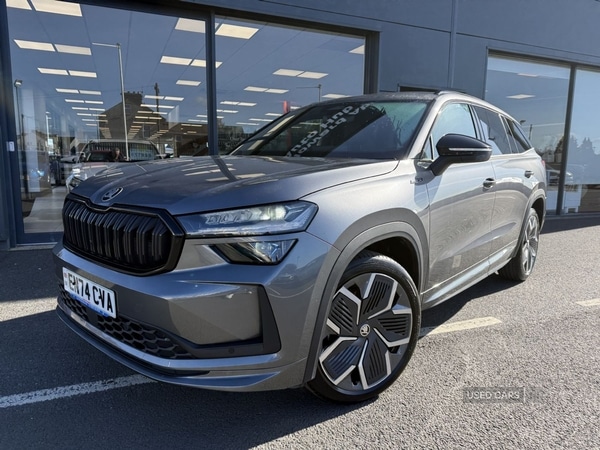 LurganInsurance Group 20, 0 Previous Owners, January 2025 first registered. One keeper from new. New model Skoda Kodiaq SPORTLINE 1.5 TSi eTEC 150ps petrol with 48V mildhybrid system. 7speed DSG automatic. 2WD. 7 seats. Graphite Grey metallic paint. 5,006 miles. CO2 143g/km. Hybrid 48volt system which recuperates energy during braking, supporting the petrol engine with an electric boost, and allows the car to coast with the engine off. When this car was first registered the Recommended Retail Price (RRP) was £43,605 on the road. This car is subject to the annual VED supplement, currently £425 until 31/12/2030. The presentation of this car is excellent. On the exterior body panels there are no obvious visual blemishes. There are no visual scrapes, scuffs or heavy stone chips. The 20 diamond cut alloys have no visual curbing marks and are in perfect presentation. All four tyres are Hankook premium brand. With tyre inflation kit. The interior is equally pristinely kept. There are no signs of wear and tear on the microsuede upholstery. There are no obvious visual marks on then cabin trim panels or plastics. Skoda genuine textile floor mats are fitted. 2x remote keys present. Locking whee; nut present. Non smokers car. The balance of Skoda's 3Year/60,000 mile warranty applies subject to continued manufacturer recommended routine servicing. conditions met