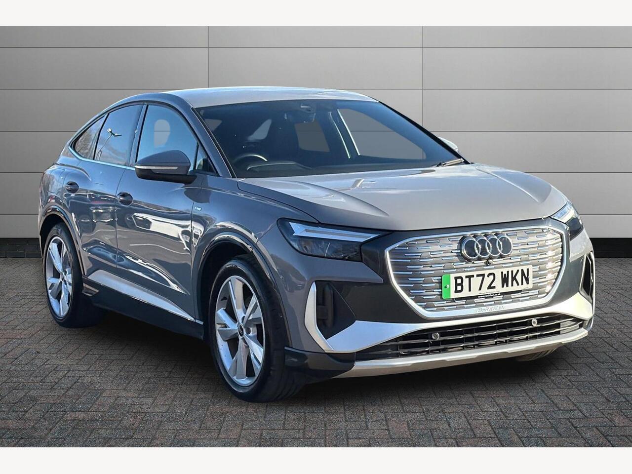 Ellesmere PortInsurance Group 27, 0 Previous Owners, Audi connect safety and service (ecall), Audi drive select, Audi Smartphone Interface with wireless functionality, Audi Virtual Cockpit 10.25" display, Bluetooth interface, Camera based traffic sign recognition, Lane departure warning system, MMI Navigation Plus with high resolution 11.6 inch touchscreen colour display, Power operated tailgate, Progressive steering, Swerve assist and turn assist, 100kW DC charging capability, 7.2 kw On board Charger, AC and DC charging access point positioned on the rear right, Compact etron charging system, Household plug type G (GB), Industry plug CEE 32 A/230 V/6 h/long + straight, Mode 3 AC charging cable 22 kW, 2 USBC ports with charge and data functions, Audi sound system with 8 speakers, DAB Digital radio, 3rd brake light, Acoustic glass windscreen, Body coloured door mirrors, Contrast bumpers in Manhattan grey, Electrically adjustable/heated/folding/auto dimming door mirrors with integrated LED indications + kerb view function for passenger side, Frameless auto dimming interior rear view mirror, LED daytime running lights, Projection light in the exterior mirrors, etron logo projected from the underside of the exterior mirror onto the ground, Rear side wing doors, Rear wiper, S line badges on front wings, S line exterior styling, Side and rear window privacy glass, Single frame grille with a structured, closed surface within an octagonal shape, 3 seat bench in 2nd row, 3 zone automatic air conditioning, 4 way electric lumbar support for driver and front passenger, Accent surfaces in gloss black centre console control panel, switch panel and trim on front doors in gloss black, Auxiliary air conditioning, Black cloth headlining, Comfort front centre armrest, Driver/passenger manual seat height adjustment, Front and rear head restraints, Front door sill trims with aluminium inlay, illuminated with S logo, Front/rear floor mats, Heated front seats, ISOFIX child seat mounting for front passenger and outer rear seats including top tether attachment point of outer rear seats, Single front passenger seat, Stainless steel pedals, Gloss styling pack Q4 Etron, Non smoking pack Q4 Etron, 3x3 point rear seatbelts, Active vehicle alerting system (AVAS), Driver and front passenger airbag with passenger airbag deactivation, Electric child locks, Front side airbags with head airbags and interaction airbag, Presense front with pedestrian and cyclist detection, Seatbelt warning, Tyre pressure loss indicator, Warning