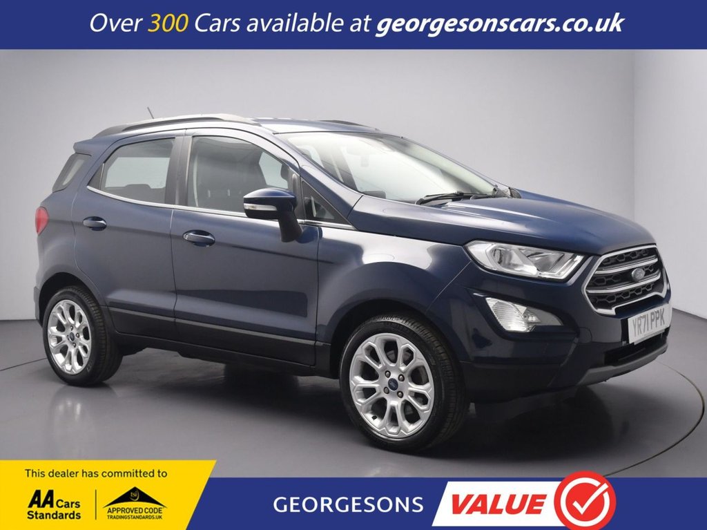 LiverpoolInsurance Group 12, 0 Previous Owners, The Ford EcoSport 1.0T EcoBoost GPF Titanium combines a responsive 1.0litre turbo petrol engine with 125hp, delivering 062mph in 11.0 seconds and up to 53.3mpg in this frontwheeldrive setup with a precise 6speed manual transmission. The Titanium trim offers premium comfort and style with a highgrade interior for versatile compact SUV driving. With one owner, this EcoSport is in excellent condition. Navigate effortlessly with integrated satellite navigation, Apple CarPlay, Bluetooth and DAB radio, ensuring seamless connectivity on every journey. Parking is a breeze thanks to the reverse camera and parking sensors, providing clear visibility and confidence in tight spaces. Stay comfortable with climate control and the heated windscreen for quick defrosting yearround. Cruise control with speed limiter enhances relaxation on highways. The practical fivedoor SUV design includes a 356litre boot for everyday versatility Georgesons Cars, one of the leading used car dealerships near me, has been serving Liverpool and the wider Merseyside area since 1955. As a thirdgeneration familyrun business, we offer a wide variety of cars for sale, including over 300 quality used cars in Liverpool. Whether youre searching for cars for sale in Liverpool or reliable auto used cars, our inventory is pricechecked daily, ensuring competitive pricing. Rated 5stars on TrustPilot, Georgesons Cars proudly upholds the AA dealer promise and Chartered Trading Standards approval. Contact us today to explore our full range of cars for sale and let our team help you find your next car!.Adjustable Boot Load Floor, Air Conditioning Electronic Automatic Temperature Control EATC, Airbags Curtain, Airbags Driver and Front Passenger, Airbags Drivers Knee, Airbags Front Passenger DeActivation Switch, Alarm Thatcham Category 1 with Volume Sensing and Perimeter, Analogue Instrument Cluster, AntiLock Braking System ABS with Electronic Stability Control ESC, AutoDimming Electrochromic RearView Mirror, Automatic Headlights, Black Roof Rails, Blazer Blue, Centre Console Sliding Armrest, Centre Console Cup Holder with Chrome Accent, Child Locks, Chrome Headlight Bezel, Courtesy Light Front with Two Map Lights, Courtesy Light Rear, Cruise Control, Door Frame Beltline Chrome, Door Handles Body Colour, Door Mirrors Body Colour Housing, Door Mirrors Electrically Operated and Heated, Driver and Passengers Sun Visor with Covered Vanity Mirror and Ticket Strip on Drivers Side, Driver Seat Manual Rotary Knob Lumbar Support Adjustment, Drivers Seat Height Adjust, Drivers Stowage Glovebox, Electric Windows Front, Electric Windows Rear, Emergency Assistance, Engine Immobiliser, EPAS Electric Power Assisted Steering, ESP Electronic Stability Programme with Hill Launch Assist, Ford Easy Fuel Capless Refuelling System, Ford SYNC 3 Navigation with 8in Touchscreen, Front and Rear Bumper Body Colour with Dark Insert, Front and Rear Folding Grab Handles, Front and Rear Power Points 12V, Front Fog Lights, Front Fog Lights and Turn Indication Light Bezel Body Colour, Front Grille Bars and Surround Chrome, Front Seat Passenger Manual ForeAft and Recline Adjustment, Front Seat Under Passenger Seat Stowage, Front Seats 2Way Head Restraint UpDown, Front Seats 3 Point Seat Belts with Load Limiter and Seatbelt Height Adjust, Front Seats SeatBack Map Pockets, Front Suspension Independent with MacPherson Struts and AntiRoll Bar, Full Length Overhead Console with Sunglasses Holder, Gear Shift Indicator, Gearshift Knob Black Insert and ChromeFinish Ring, Halogen Rear Lights, Headlights Courtesy Delay, Headlights Levelling Control, High Mounted Brake Light, IPS Intelligent Protection System, LED Daytime Running Lights, LED Low Beam Headlights, Load Compartment Lights, Load Compartment Carpet, Load Compartment Side Trim Incorporating Shopping Hooks, Lower Body Side Door Claddings Black with Chrome Insert, Manual Parking Brake, MyKey, PreCollision Assist with AEB, Quickclear Heated Front Windscre