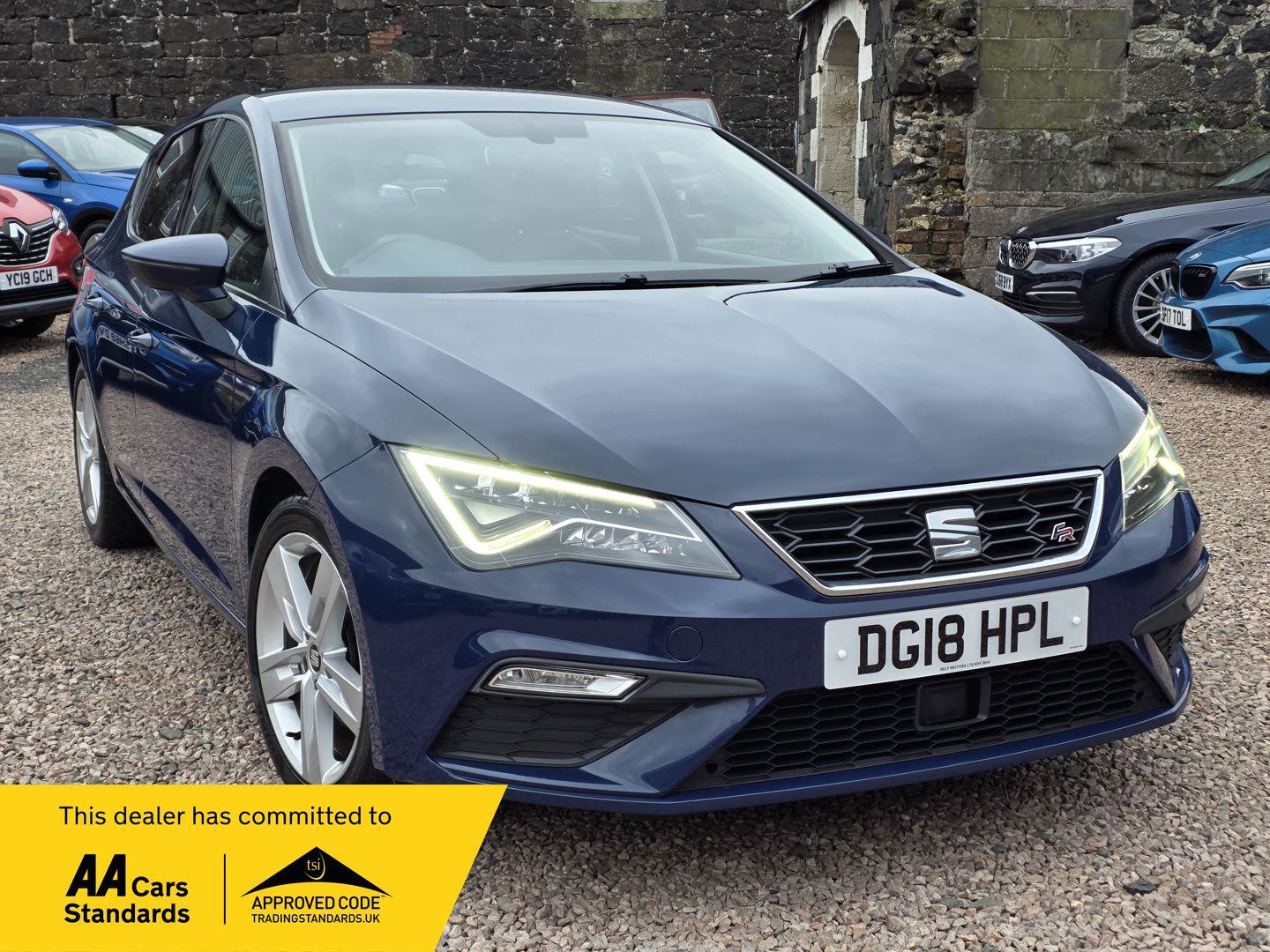 Seat Leon in FR sports styling 2018 SEAT LEON 1.4 TSI FR TECHNOLOGY £9750 64,200 miles Mediterranean Blue FR sports body styling Apple CarPlay and Android Auto Sports seats with red stitching Full LED headlights 125BHP returning 54MPG Navigation system, LED taillights, drive mode selection, cruise control, rear parking sensors, power fold mirrors, ambient lighting, sports suspension, dual zone climate control, auto headlights and wipers AA Cars Motor Dealer Warranty