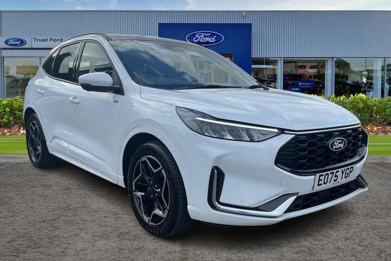 Insurance Group 20, 12.3 digital colour instrument cluster, 360 degree view camera, Clear exit assist, Cross traffic alert with active braking, eCall (emergency call), Ford easy fuel, Ford SYNC 4 Navigation with 13 touchscreen, DAB radio, emergency assistance, Andriod Auto/Apple CarPlay, 5G modem & Ford Pass connect, Front and rear parking sensors, Hands free power tailgate, Lane centering assist, Lane keeping aid with lane departure warning, Power assist steering, Selectable drive modes, Service interval indicator, Auto headlamps with high and low beam, Black roof rails, Body colour bumpers, Front LED fog lamps, Large rear spoiler, LED daytime running lights, LED rear lights, LED third brake light, Pop out door edge protectors, Power front/rear windows with global close, Power heated folding door mirrors with puddle lights, memory function and camera, Power opening panoramic roof, Quickclear heated windscreen, Rain sensing wipers, Rear privacy glass, Rear side wing doors, Rear wiper, STLine body styling kit, 2nd row sliding seats, Electronic automatic temperature control (EATC), Front and rear head restraints, Partial premium touch sensico upholstery, Rear centre head restraint, Single front passenger seat, Sports seats, 3x3 point rear seatbelts, Airbags front driver/passenger, front and rear curtain, Drivers knee airbag, Dynamic brake support, Electronic stability control (ESC) and ABS, Evasive steering assist, Ford MyKey Gen 2 safety system, Manual child proof rear door locks,