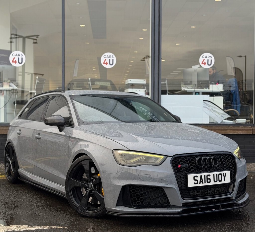 Edinburgh.12V Power Socket Rear, 12V Power Socket Rear x2, 19in Alloy Wheels 5Arm Rotor Design Galvanised Silver, ABS AntiLock Braking System, AMI Audi Music Interface, ASR Anti Slip Regulation, Adaptive Brake Lights, Airbags Driver, Airbags Drivers Knee, Airbags Front Passenger, Airbags Front Side, Airbags Head Level Side For Front and Rear, Alarm Thatcham Category 1, All Weather LED Headlights, Aluminium Interior Elements, Aluminium Look Pedals, AluminiumEffect Door Mirror Housings, Anti Theft Locking Wheel Bolts, Audi Drive Select, Audi Parking System Plus, Audi Parking System Rear with Acoustic Indicators, Automatic Wipers with Rain Sensor, Brake Calipers High GlossBlack with RS3 Logo, Cables x2 MP3 Connection Including iPod, Car Jack, Cloth Headlining in Black, Colour Drivers Information System DIS, Cup Holders x2 in Centre Console, DAB Digital Radio, Display Screen Colour 5.8in, Door Mirrors Electrically Adjustable and Heated, Door Sill Trims Aluminium with RS3 Logo, DualZone Electronic Climate Control, EBD Electronic Brakeforce Distribution, EDL Electronic Differential Lock, ESP Electronic Stability Programme, Electric Windows Front and Rear, Electromechanical Parking Brake, Exhaust Tailpipe RS, First Aid Kit, Front Bumper with Enlarged Air Inlets, Front Centre Armrest, Front Passenger Airbag Deactivation Switch, Front Sports Seats, Front and Rear Floor Mats, Full European Map Data, Grab Handles Dampered, Head Restraints Rear, Headlights ComingLeaving Home Function, Headlights Light Sensor, Heat Insulating Glass, Heated Front Seats, Heated Rear Windscreen, ISOFIX Child Seat Mounting for Front Passenger and Rear Outer Seats, Immobiliser, Inlays 3D Design Black, Interior Elements Air Vents Aluminium, Interior Elements Frame Around the Inside Door Handle Aluminium, Interior Elements Glove Compartment Aluminium, Interior Elements Window Control Switches Aluminium, LED Daytime Running Lights, LED Rear Lights, Luggage Compartment Side Net, MMI Radio, MMI Touch, Manual Front Seat Adjustment, Mobile Telephone Preparation Bluetooth Interface, Pollen Filter, Progressive Steering, RS Body Styling, RS Brake System High Performance, RS Instrument Panel with Black Dials and Red Needles, RS Sports Suspension, Radiator Grille Honeycomb Design, Rear Diffuser RS3, Remote Central Locking with 2 Fold Away Keys, Roof Spoiler RS3 Specific in Body Colour, Satellite Navigation System SD C