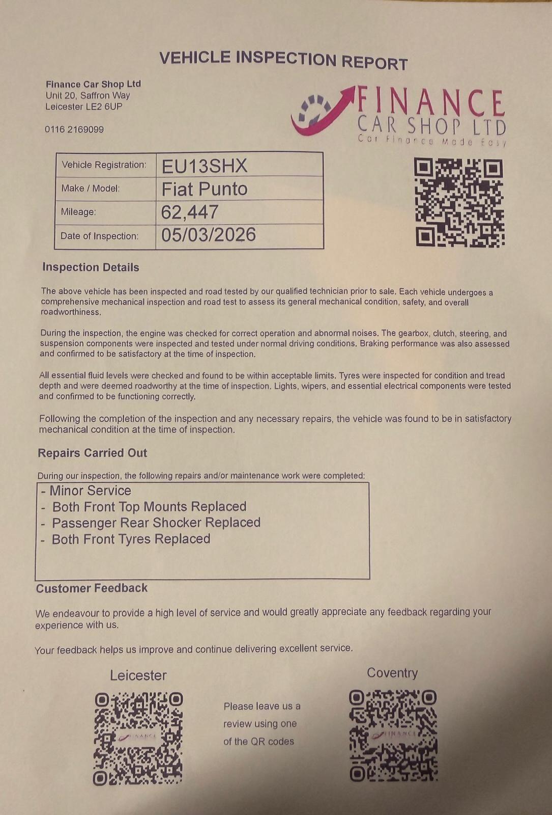 LeicesterInsurance Group 8, 2 Previous Owners, Looking for a practical, affordable, and stylish hatchback? This Fiat Punto 1.4 Easy is the perfect choice for city driving and longer journeys alike. Comfortable, economical, and easy to drive, its an ideal car for new drivers, commuters, or anyone wanting a dependable daily vehicle.Key Features:1.4L Petrol Engine Smooth performance with great reliabilityManual Transmission Enjoy full control and efficient driving5 Doors Easy access for passengers and extra practicalityEuro 5 Compliant Environmentally friendly and economicalComfortable Interior with supportive seatingElectric Windows & MirrorsAir Conditioning for yearround comfortSteering Wheel ControlsSpacious Boot Perfect for shopping, luggage, or daily useLow running costsReliable Italian engineeringIdeal first car or economical runaroundPractical 5door design+ 6 MONTHS WARRANTY INCLUDED + 6 MONTHS BREAKDOWN COVER + EXTENDED WARRANTY AVAILABLE + FINANCE OPTIONS AVAILABLE UPON REQUEST + DELIVERY CAN ONLY BE ARRANGED ONCE THE VEHICLE HAS BEEN VIEWED & INSPECTED IN PERSON AT OUR PREMISES + PHOTO ID IS REQUIRED FOR ALL VIEWINGS AND TEST DRIVES + WE CAN BE REACHED VIA WHATSAPP ON 07458 300017 FEEL FREE TO MESSAGE US + PLEASE NOTE, THE PRICE IS FIXED ON THIS VEHICLE. KINDLY BE AWARE OF THIS PRIOR TO ARRANGING A VIEWING + WE HAVE OVER 50 VEHICLES IN STOCK. AS NOT ALL VEHICLES ARE HELD ON SITE, PLEASE ENSURE YOU CALL IN ADVANCE BEFORE MAKING YOUR JOURNEY + BANK TRANSFER ONLY + MORE CARS AVAILABLE AT:WWW.FINANCECARSHOPLTD.CO.UK +