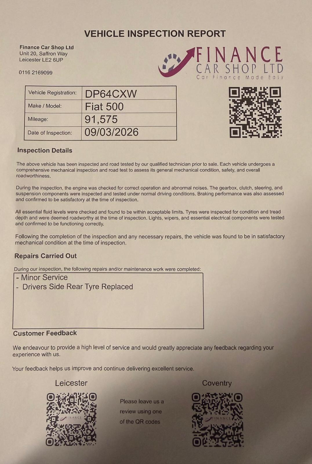 LeicesterInsurance Group 9, 1 Previous Owner, Fiat 500 1.2 Pop Euro 6 (s/s) 3dr Stylish, Economical & Perfect for City Driving!If you're looking for a compact, stylish, and economical car, this Fiat 500 1.2 Pop is a fantastic choice. With its iconic Italian design, low running costs, and easy driving experience, its the perfect car for firsttime drivers, city commuters, or anyone wanting a fun and practical hatchback.Key Features:1.2L Petrol Engine Reliable and economicalManual Gearbox Smooth and easy to driveEuro 6 Compliant Lower emissions and cheaper running costs3 Door Hatchback Compact and easy to parkElectric Front WindowsElectric Power Steering with City ModeStylish Interior with Classic Fiat DesignExcellent Fuel EconomyWhy Buy This Car?Very low running and insurance costsPerfect first carCompact size makes parking and city driving effortlessFun, stylish, and practical+ 6 MONTHS WARRANTY INCLUDED + 6 MONTHS BREAKDOWN COVER + EXTENDED WARRANTY AVAILABLE + FINANCE OPTIONS AVAILABLE UPON REQUEST + DELIVERY CAN ONLY BE ARRANGED ONCE THE VEHICLE HAS BEEN VIEWED & INSPECTED IN PERSON AT OUR PREMISES + PHOTO ID IS REQUIRED FOR ALL VIEWINGS AND TEST DRIVES + WE CAN BE REACHED VIA WHATSAPP ON 07458 300017 FEEL FREE TO MESSAGE US + PLEASE NOTE, THE PRICE IS FIXED ON THIS VEHICLE. KINDLY BE AWARE OF THIS PRIOR TO ARRANGING A VIEWING + WE HAVE OVER 50 VEHICLES IN STOCK. AS NOT ALL VEHICLES ARE HELD ON SITE, PLEASE ENSURE YOU CALL IN ADVANCE BEFORE MAKING YOUR JOURNEY + BANK TRANSFER ONLY + MORE CARS AVAILABLE AT:WWW.FINANCECARSHOPLTD.CO.UK +